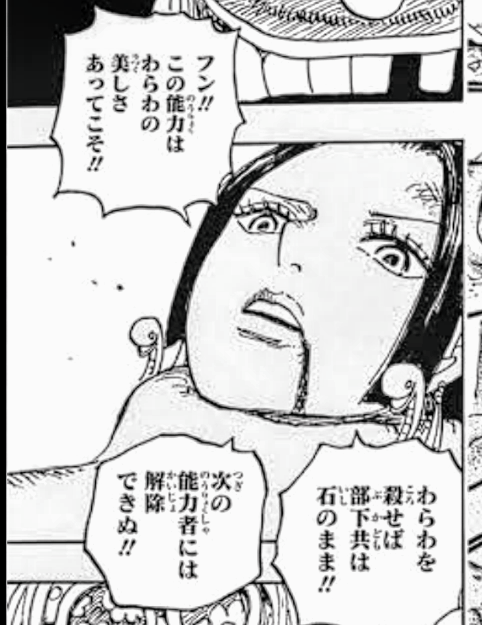 頂上戦争見てると仮にルフィみたいに色気が効かない奴にもやろうと思えば石化できるんだよな