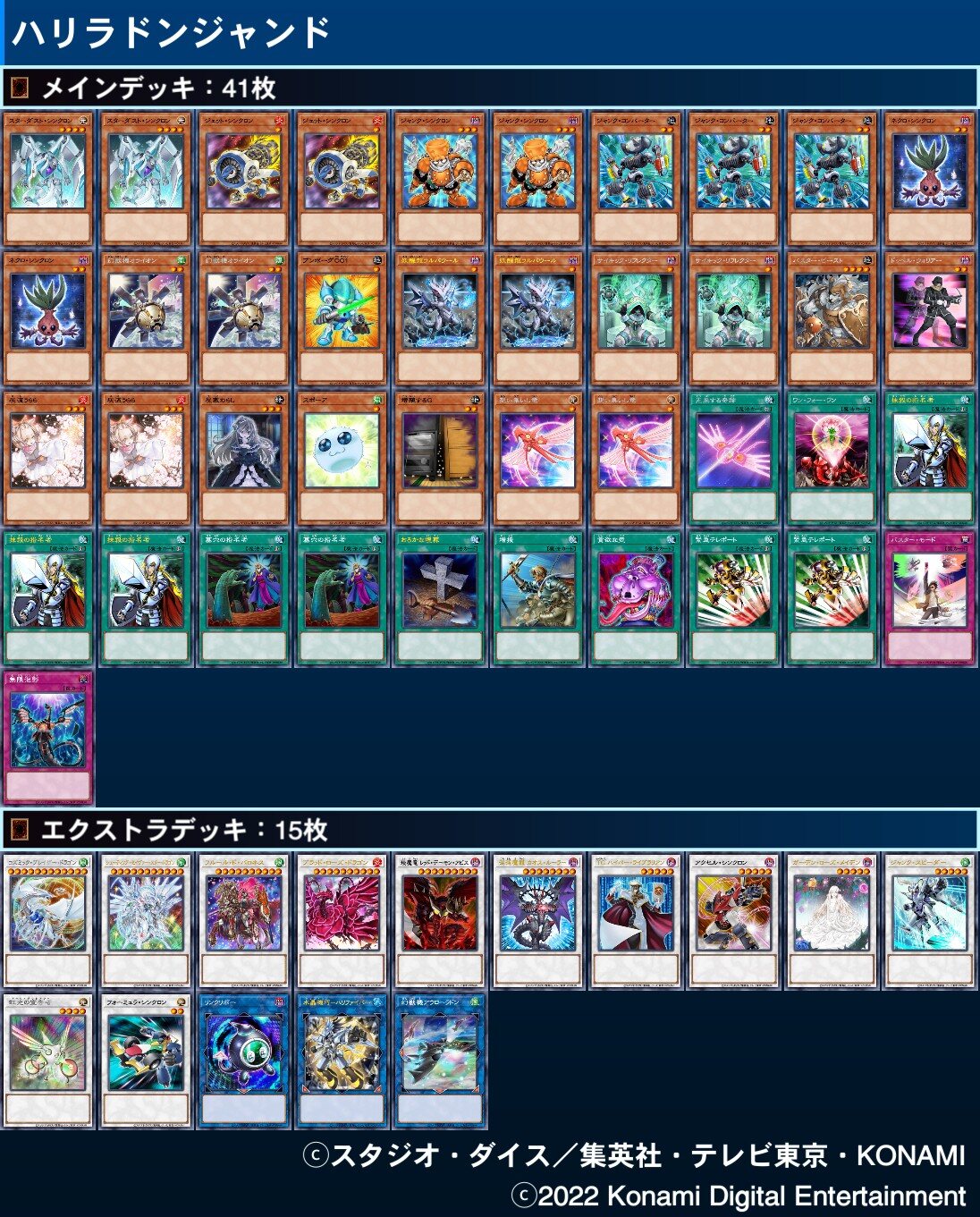 スピーダーからジャンク、サテライト、ジェット、スタダシンクロンss→光来する軌跡サーチ→スピードとジェットでスタダウォリアー→軌跡発動で思い集いし竜デッキトップ→スタダウォリアーとサテライトでクリスタルウィングSドラゴン→ドローで集いし竜SSでラルバウールリクルート→ラルバウール効果でジャンク指定でドッペルサーチ→ドッペル、思い、クリスタルでセイヴァースター→ラルバとスタダシンクロンで司書→後はフォーミュラとメイデンでコズミックで墓地のメイデンでクリスタル蘇生