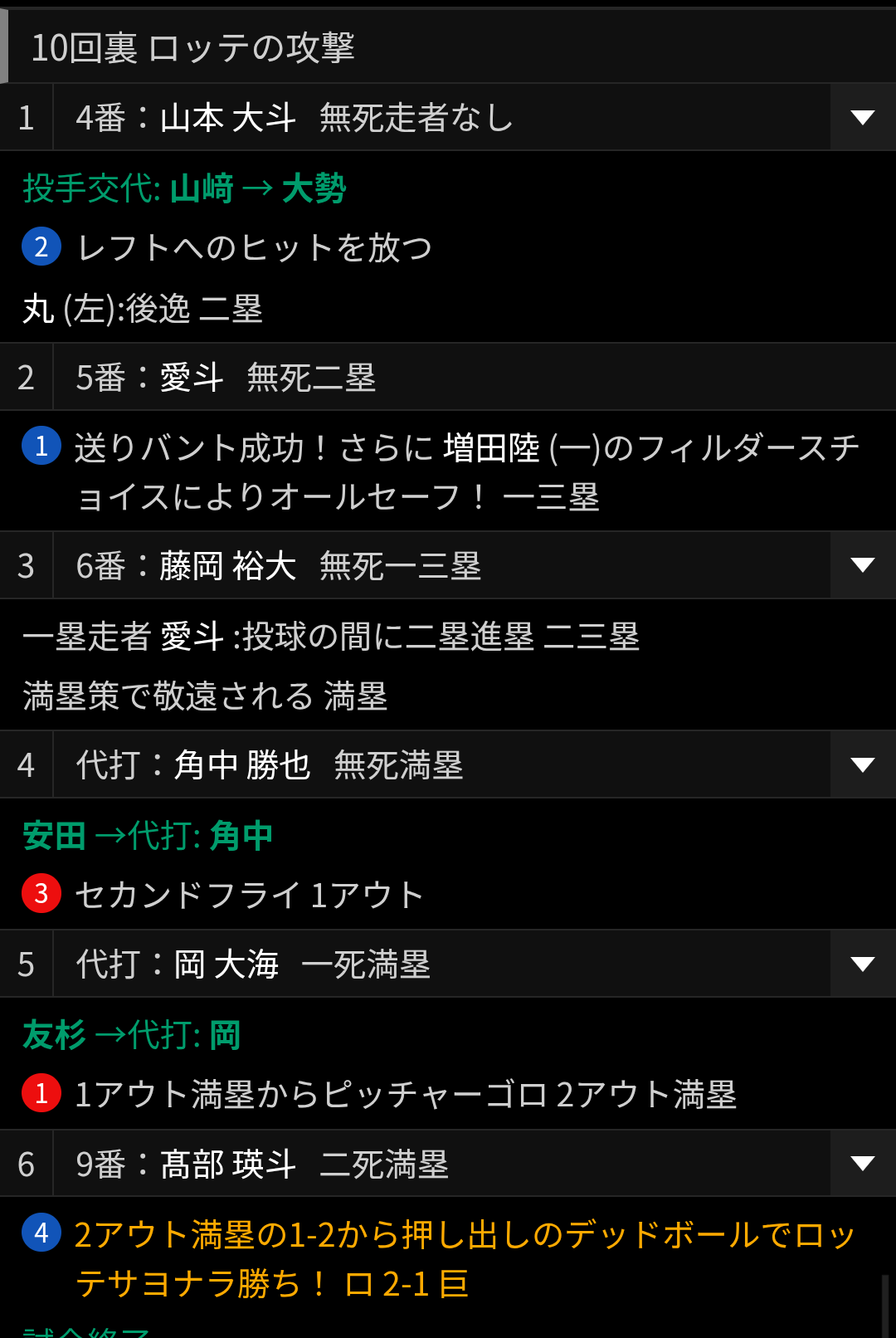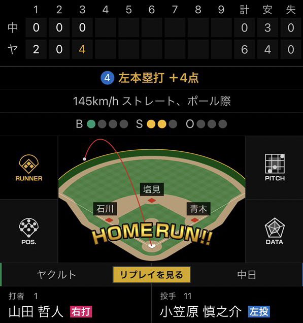 (横須賀で復調したベテラン二人の活躍で効率よく得点、祐大様も犠牲フライ、石上様も二死から得点があり嬉しい私…!)