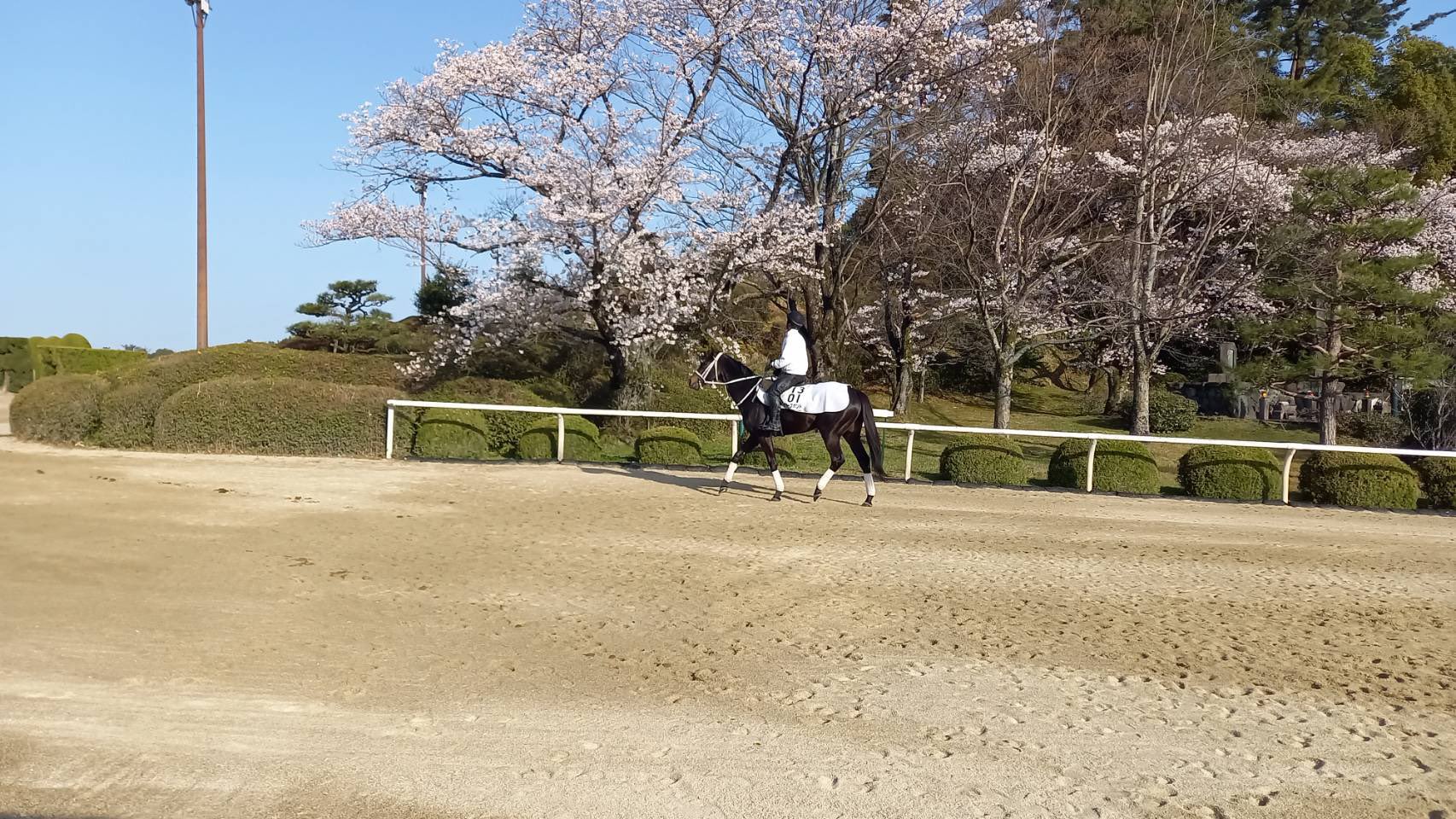 桜を背景にディープボンド。帰厩して、