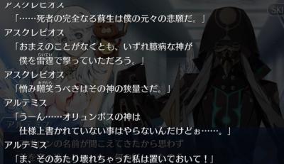 「基本的に使用されない(できない)真の宝具。かつてハデスの領域を侵し、ゼウスを怒らせたなる蘇生薬そのもの。かなり無茶な状態からでも人や半神を完全に蘇生させる力を持つ。彼はこれを用いてミノス王の子グラウコス、テセウスの子ヒッポリュトスらを蘇らせたと言われる。この薬の原料はアテナから渡された(アテナはペルセウスから捧げられた)ゴルゴーンの血である。ゴルゴーンの左半身から流れ出た血は人を破滅させ、右半身からの血は人を救済する力があったという。実のところ、ただゴルゴーンから血を採っただけでは上手くいかない。ヒッポリュトスを蘇生させたときには「アルテミスの力を得て為した」とされているため、蘇生薬はこの血に純度の高い(アテナ、アルテミス級の)神の力が込められてこそ初めて完成するものなのだろう。他にも隠し味として必要なものがあるのかもしれない。結局のところ、かつての蘇生薬は彼の医術だけではなく様々な要因と得然も関与して作り出せたものであって、アスクレピオス本人もこの蘇生薬の作り方について完全にマスターしている訳ではないのである。」(アスPマテリアル)