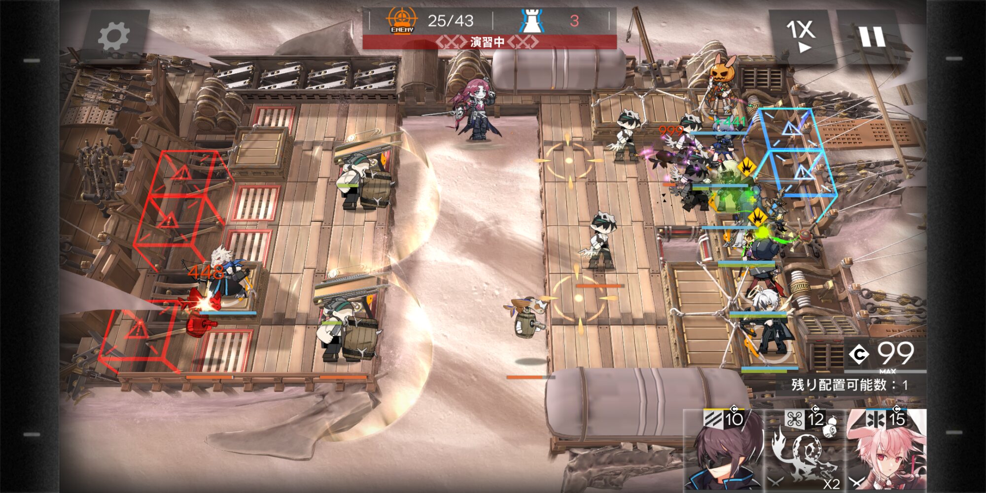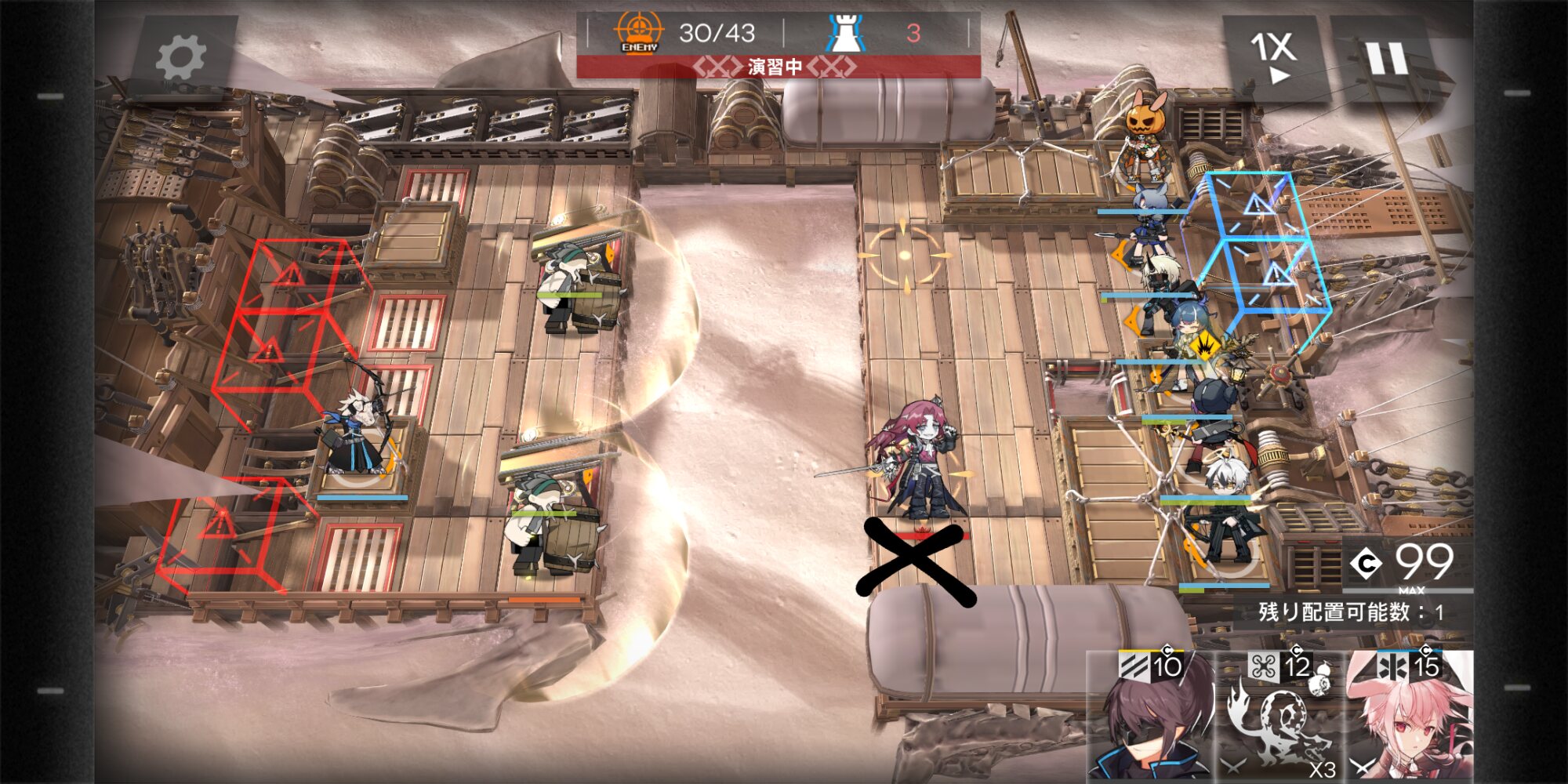 少しすると左下から爆弾樽を持ったユニットが出てくるのでリィンの召喚物や高速再配置枠で一度ブロックして樽を爆発させる(敵が密集する出口付近で爆発させると物凄く事故る)