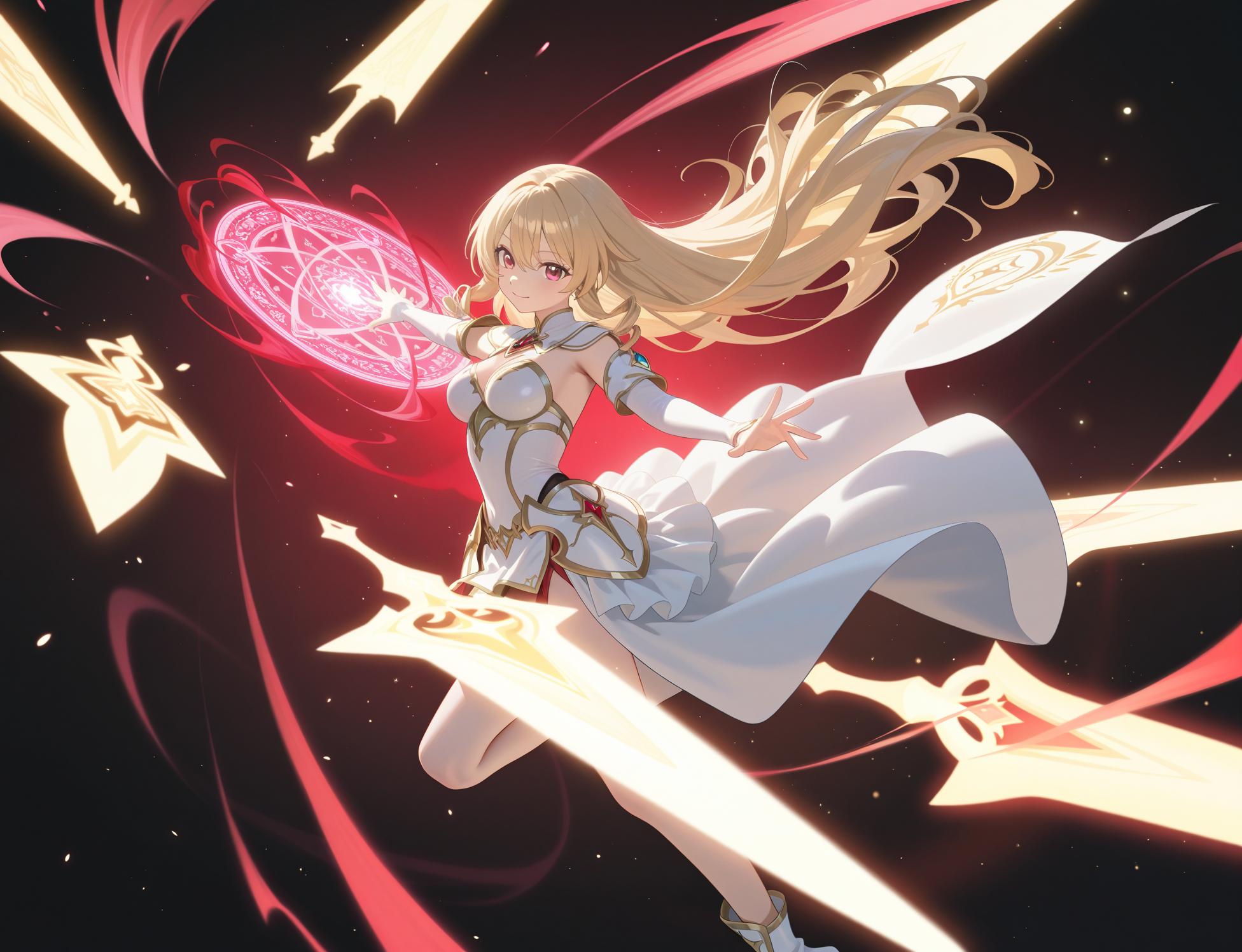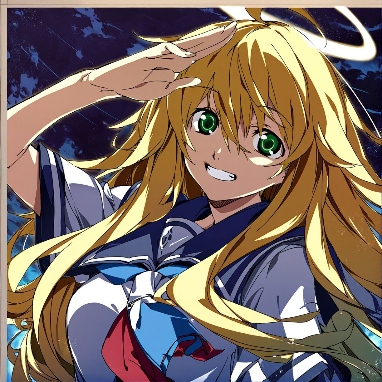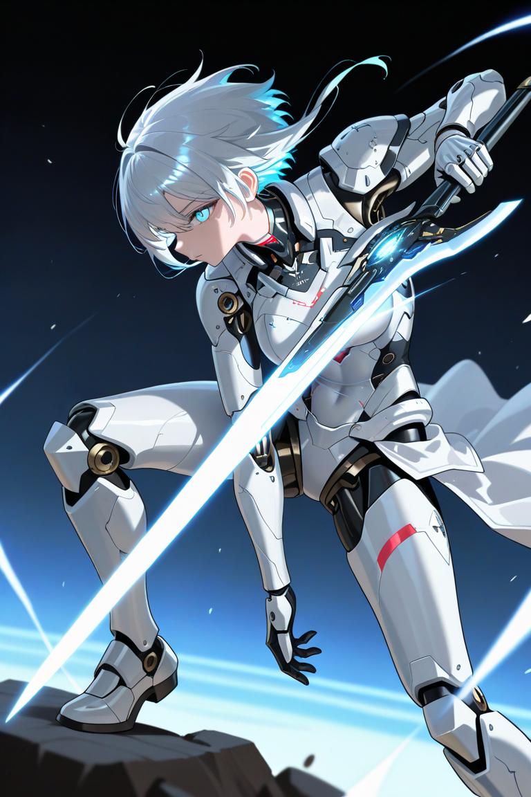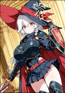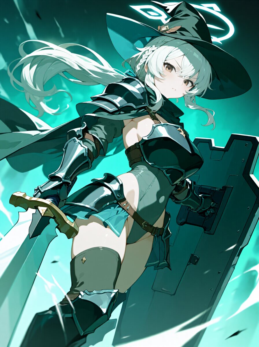 anime screencap, (anime coloring, shiny skin),(((masterpiece, best quality, super high quality))),score_9, score_8_up, score_7_up,8k,Composition, foreshortening, positioning, pose, improved pose,body composition, facial expression,expression,Reina_style,clean lineart,cel shading,teal-blue palette,soft glow,shirao eri \(blue archive\),very long hair,low ponytail,single braid,halo,white hair,single braid, brown eyes,hair between eyes,witch hat,huge breasts,High-leg leotard, breastplate, shoulder armor, gauntlets, shin guards,miniskirt-style waist guard with the front open so the leotard can be seen,,cloak,double-edged sword,Western-style shield,Cowboy shot,dutch angle, - 162二次元好きの匿名さん25/08/23(土) 03:09:45