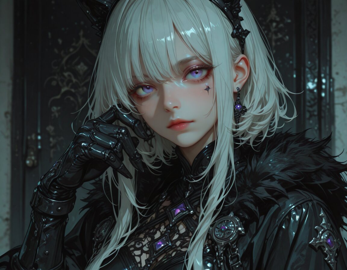 ポジティブ:beautiful anime demon girl, elegant and seductive, long silver hair, glowing pink eyes, sharp black and red demon horns, gothic atmosphere, wearing a tight red sleeveless top and a long flowing black skirt, lying gracefully on a luxurious purple cushion, mysterious smile, intricate tattoo-like patterns on her arm, gothic cathedral background with glowing stained glass and blue night sky, dramatic lighting, candles glowing warmly, highly detailed, masterpiece, 4k, perfect shading, vivid colors