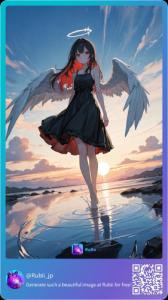 ポジティブ:1girl, solo, long hair, black hair, red eyes, dress, bare shoulders, standing, full body, multicolored hair, outdoors, red hair, wings, sky, sleeveless, barefoot, cloud, water, black dress, halo, blue sky, bare arms, sleeveless dress, dutch angle, sunlight, cloudy sky, feathered wings, colored inner hair, scenery, reflection, angel wings, sunset, sun, angel, splashing, ripples, sunrise, reflective water, standing on liquid, dawn