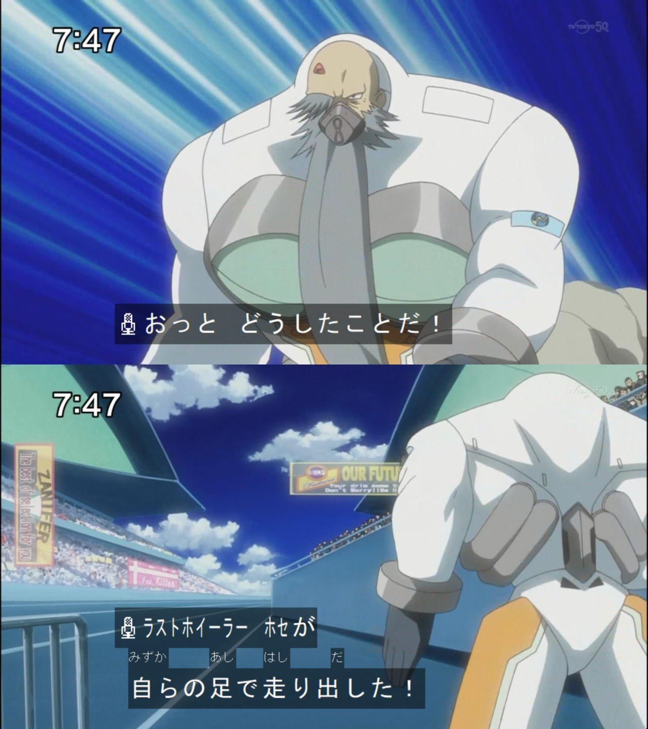 マント脱ぎ捨て→シール貼り付け→爆走→MCのナレーション