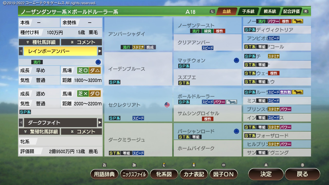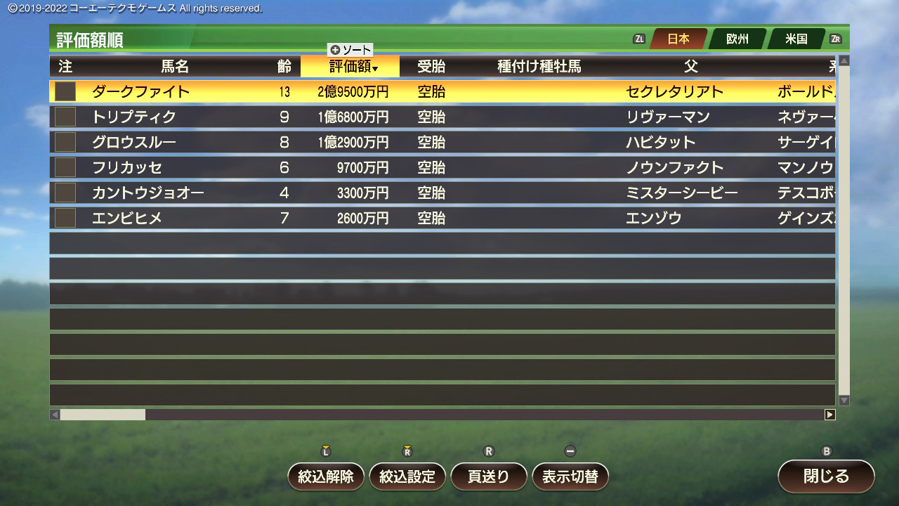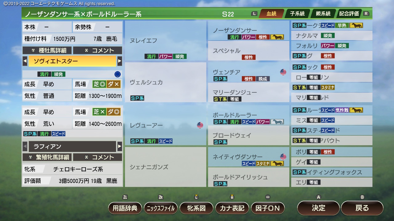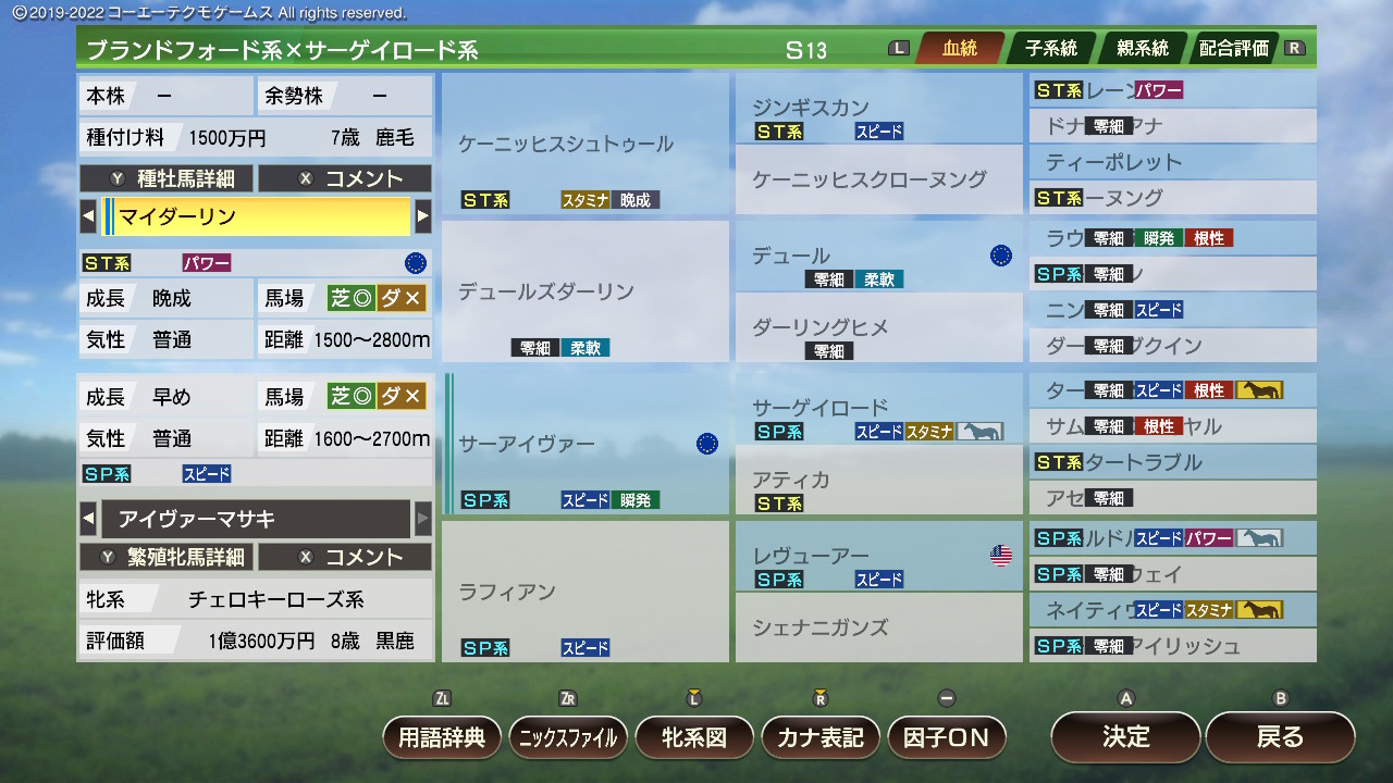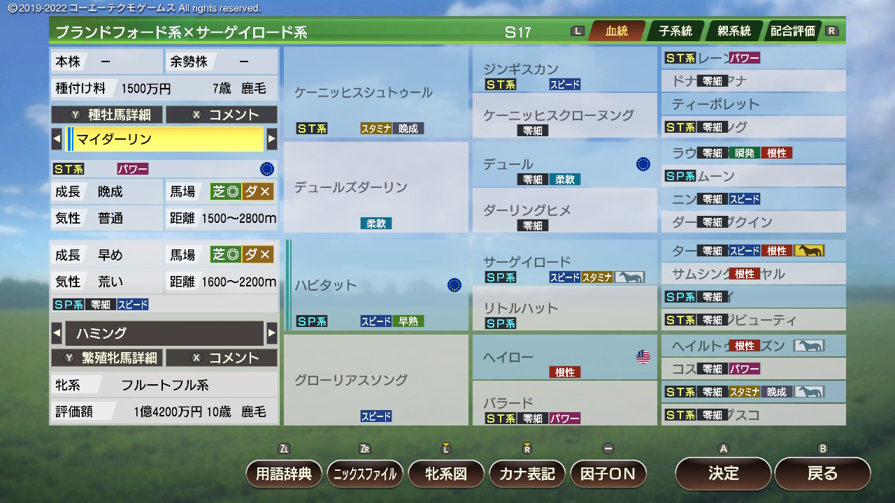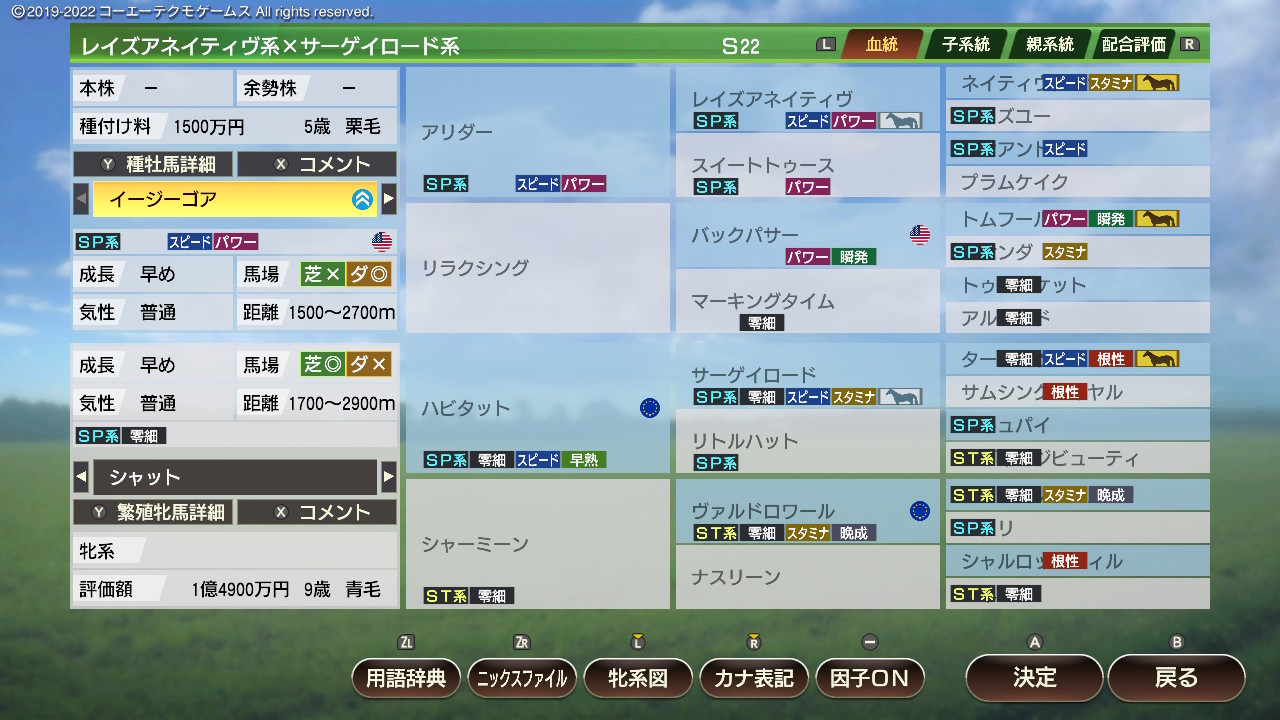 ・繁殖牝馬にとってなるべく危険度が低く(2以下理想)、爆発力が高いものを優先的につけていく。