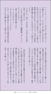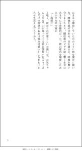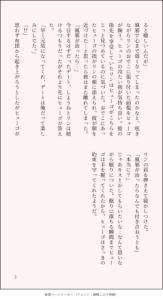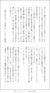 聞こえてくるのは衣擦れの音と微かな水音。好奇心を抑えられず覗いて観ると2人の男女がいた、いや2人と言うにはあまりにも距離が近く合わさってひとつの生命体のようにも見えた。濃い青髪の女が男の金髪を撫でたかと思えばその腕を彼の首元に回し身体ごと近づけ小さな唇を彼の唇に重ねた。はじめは驚愕を浮かべていた男の瞳は次第に潤んでいき最終的には睫毛を震わせ色違いの瞳を閉じた。目は閉じられているが今の彼の心は目の前の女にしか向いておらず腕は彼女の細い身体を抱きしめるために回され、唇は同じく彼女の為に捧げられている。その時間は一瞬にも永遠にも感じられた、そして二人は唇を繋いでいた銀糸が途切れる瞬間を熱く蕩けた眼差しで見つめ合っていたが、どちらも一言も発さず腕を絡ませてそのまま部屋に戻っていってしまった…。