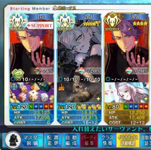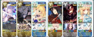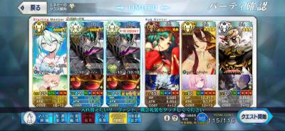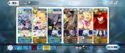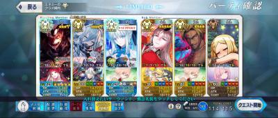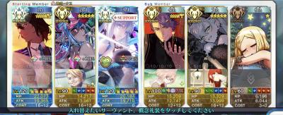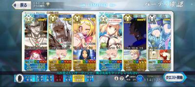 グランドオルタニキ(黒聖杯/絆礼装通常/フォウムズ)、ロウヒ(礼装なし)利休(牛魔王)フレグランドバサトリア(礼装なんでもいい)、決戦礼装で