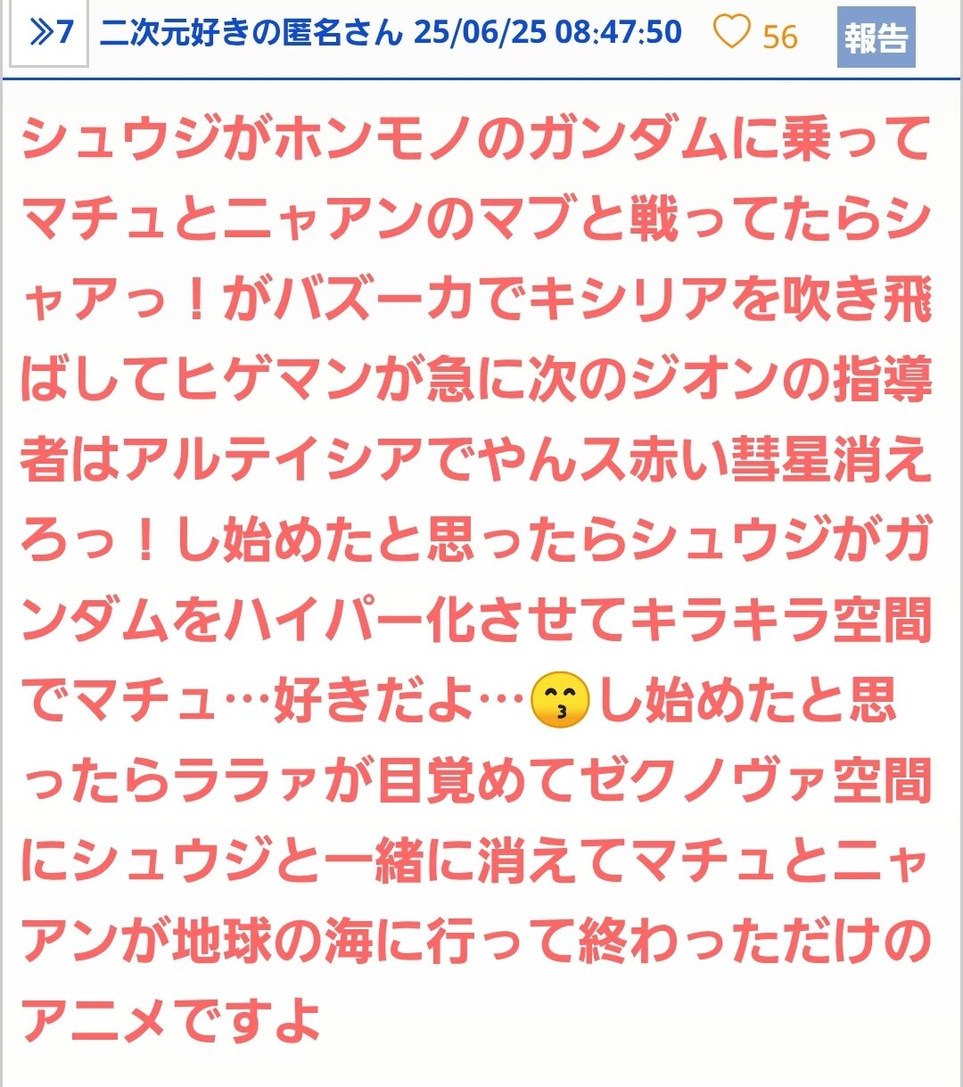 ガンダムってこんな超常現象連発するアニメじゃなかったしニュータイプ空間みたいなのそんなに長くやらない - 108二次元好きの匿名さん25/06/25(水) 19:22:39