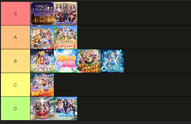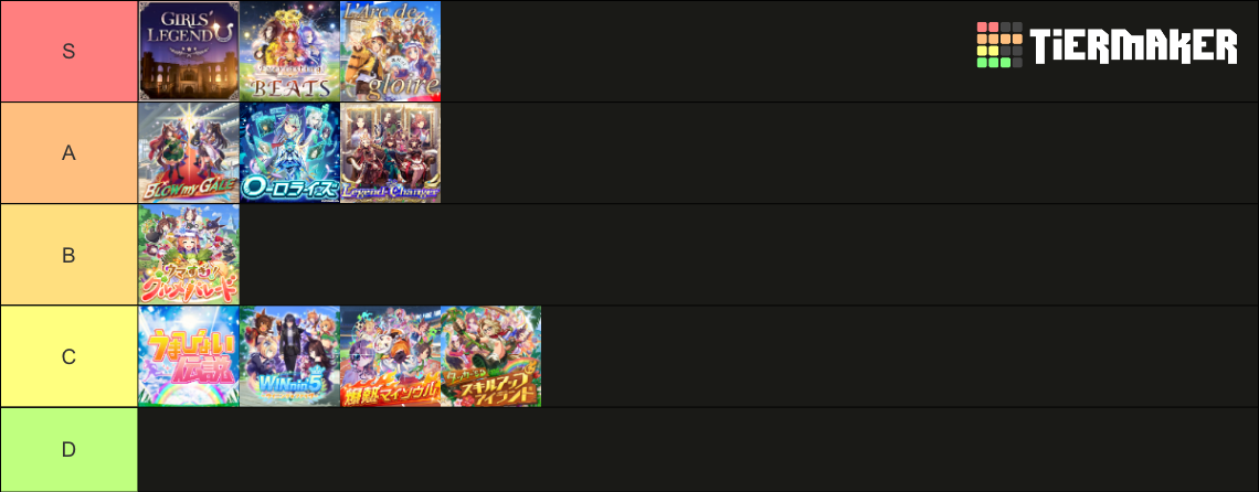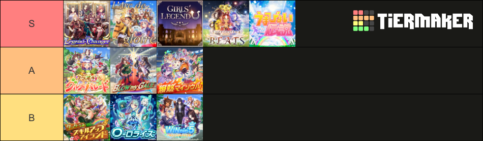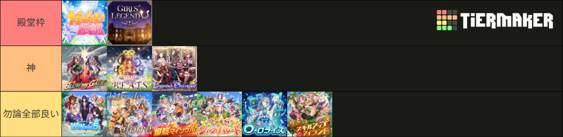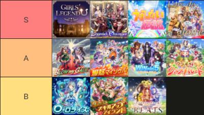 割と聞き方でぶれるってかMV的にはうまぴょい、ガールズレジェンドユー、グルメパレードが好きだけどリアルライブってなると爆熱とラークとレジェンドチェンジャーが抜けて個人的に好きなのだとラークとエバラスが抜けるは自分