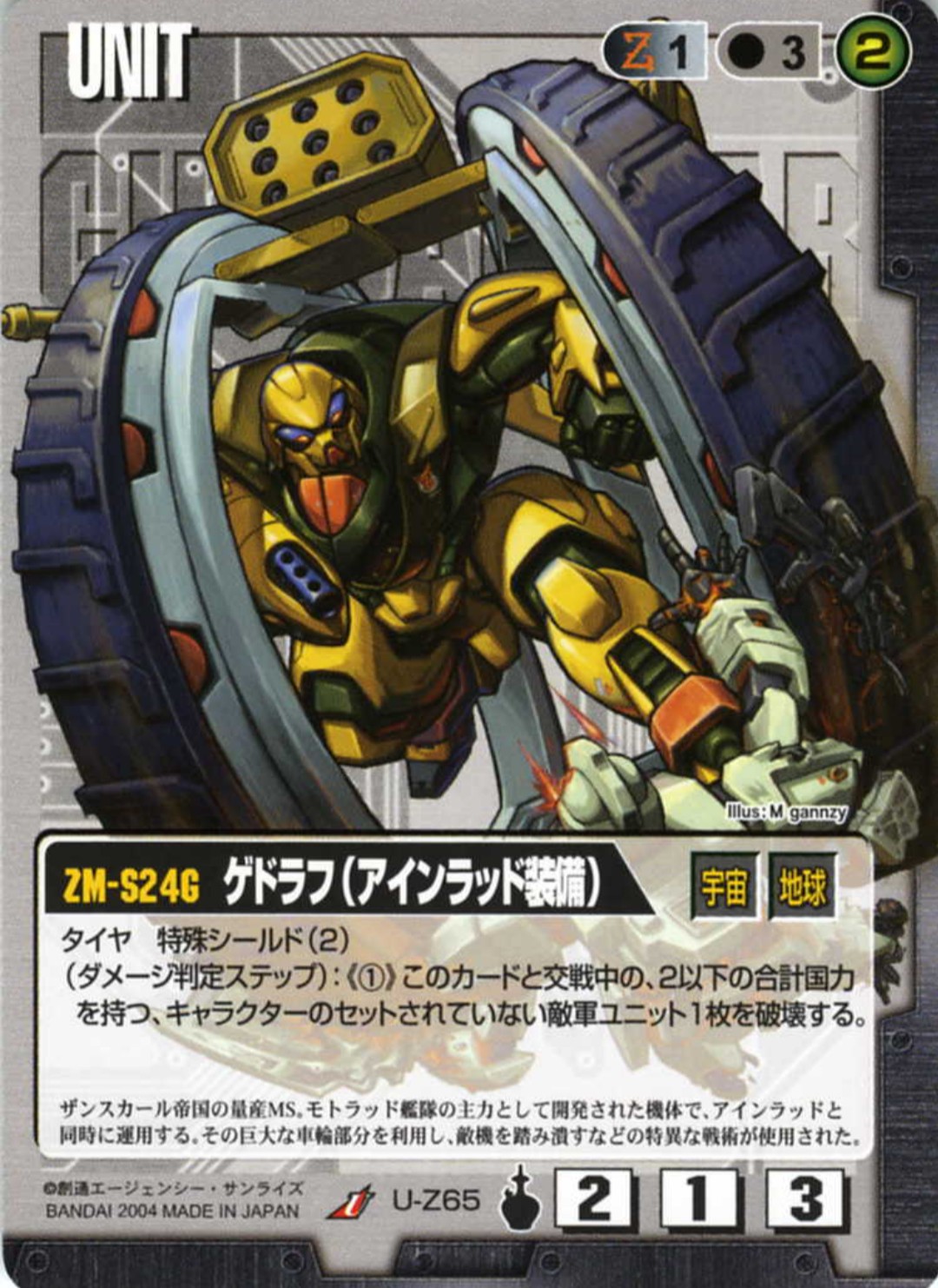 守(武器にもなるほど頑丈なタイヤ部の装甲、搭乗機のビームシールドによる鉄壁の守り)