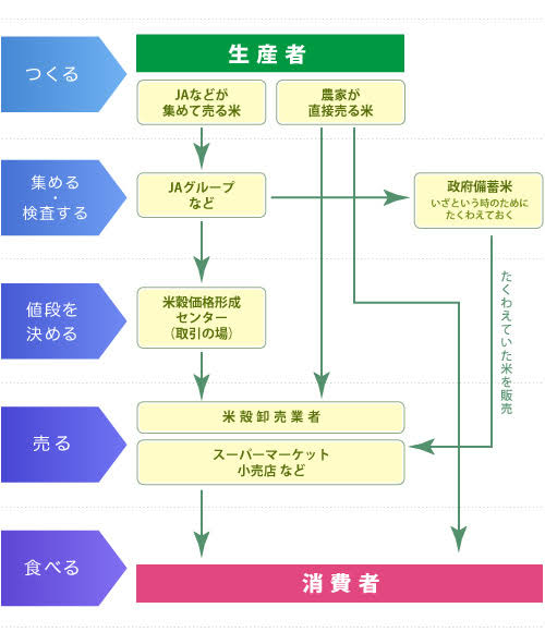 精米→包装→地域倉庫への運送→各店舗への運送