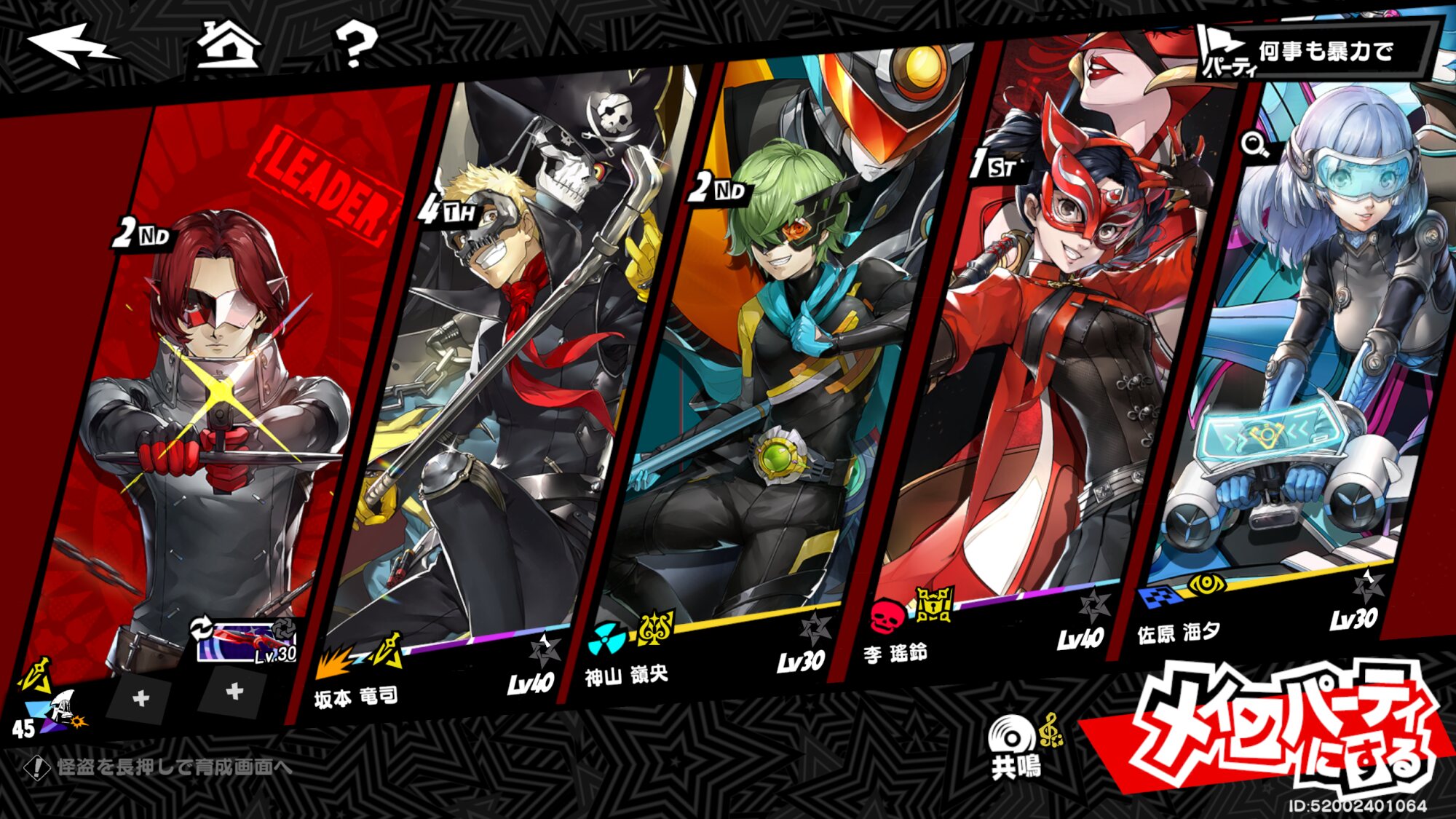 P5X キャラクター 一覧 - P5Xまとめ-「Persona5:ThePhantomX(女神异闻录:夜幕魅影)」「ペルソナ5: The Phantom X」ペルソナ5X画像は2024年9月12~26日(ver2.2)までに発表されたキャラクターの一覧です。※日付は中国版(簡体字)です。◆怪盗団メインキャラ(シナリオ加入)メインストーリー内でペルソナ能力を「覚醒」して、怪盗団の仲間に入るキャラ。①ストーリー内で仲間入りすると、そのキャラを必ず1体入手できる。②各ガチャから★4キャラとしても入手できる。(主人公以外のキャラのみ)「心の怪盗団」にワンダー達は含まれていない。