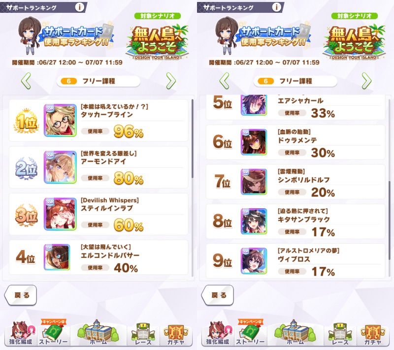 今回のシナリオはスピ5だろうがハイランダーだろうが「強いサポカ」さえあれば難易度の違いはあれどステが整うシナリオだから今までのシナリオよりかサポカ自由度が高いのは事実よ