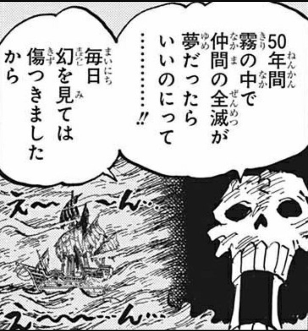 他の一味の過去回想は「夢を抱くきっかけ」「性格・人格形成の経緯」が描かれてるのにブルックはその辺すっとばして夢叶えたルンバー海賊団時代からの回想しか無いもんな