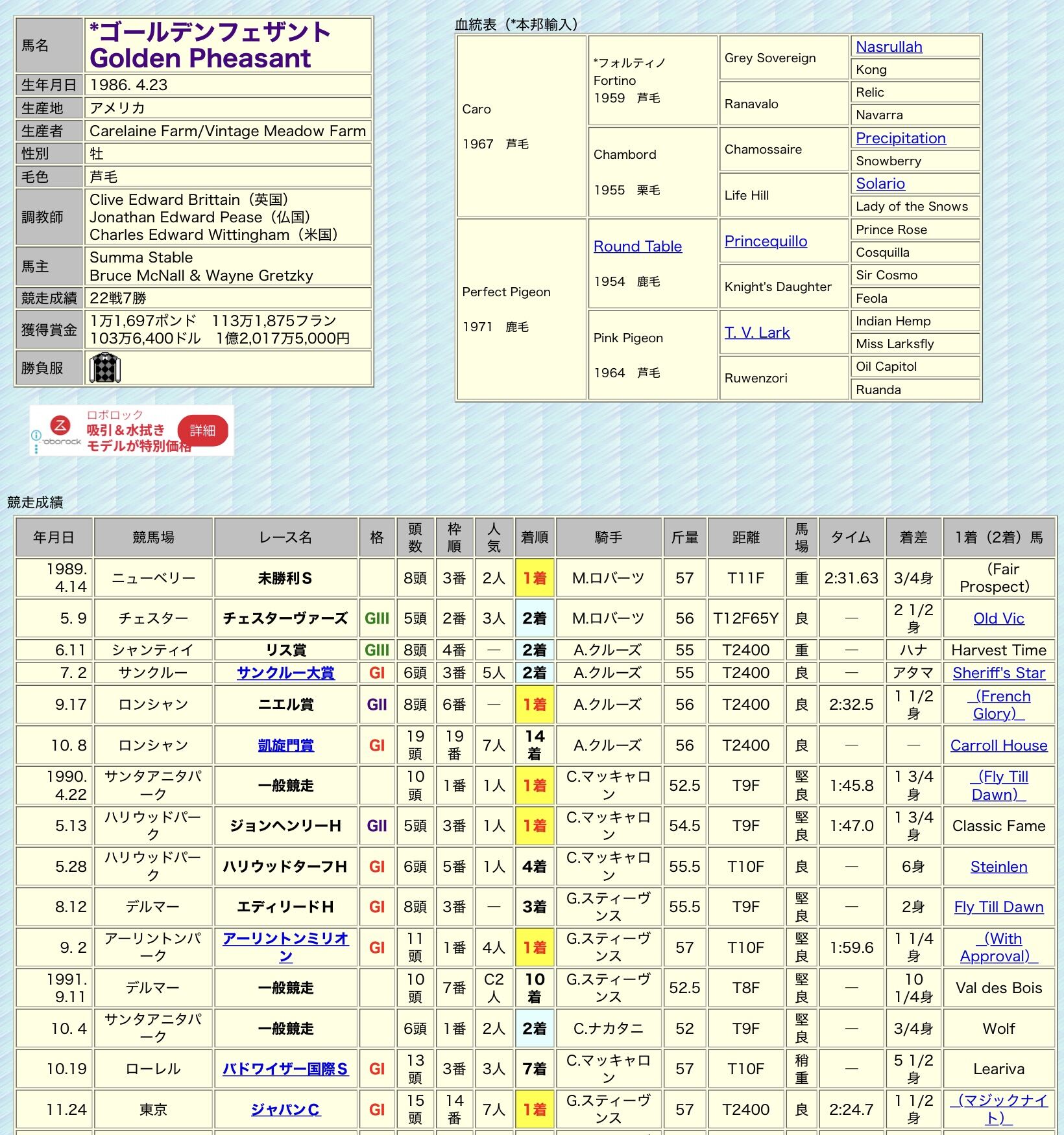 日本で種牡馬入りして近年は、ウインマイティーの母父、ディープボンドの母母父、と日高の謎血統枠で登場しがち