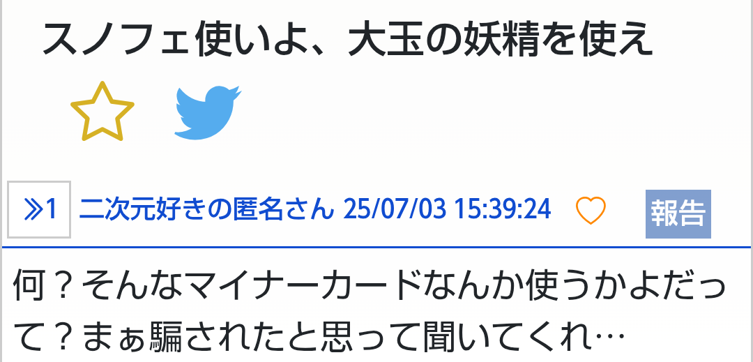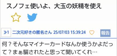なんかジャイアントとスノフェには無条件で噛み付いてくる頭ヤバいのがTCGカテに棲みついてるよな、前も無関係のスレで急にジャイアントとスノフェにキレ散らかしてる奴居たわ