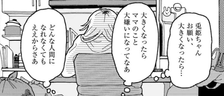 だから兎姫に「ごめんね。お願い、大きくなったらママのこと大っ嫌いになってね。どんな人間になれなくてもいいからママのことを嫌いになってね。そうすれば兎姫ちゃんは正解を選べるようになるからね。」と心の中で言っているんだ。胸が締め付けられるんだ。読んでて本当に涙が止まらないんだ。