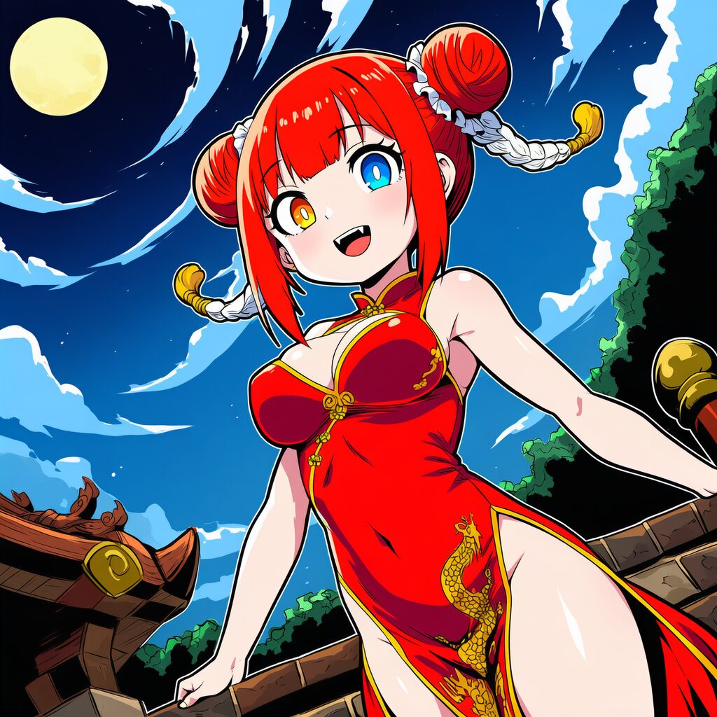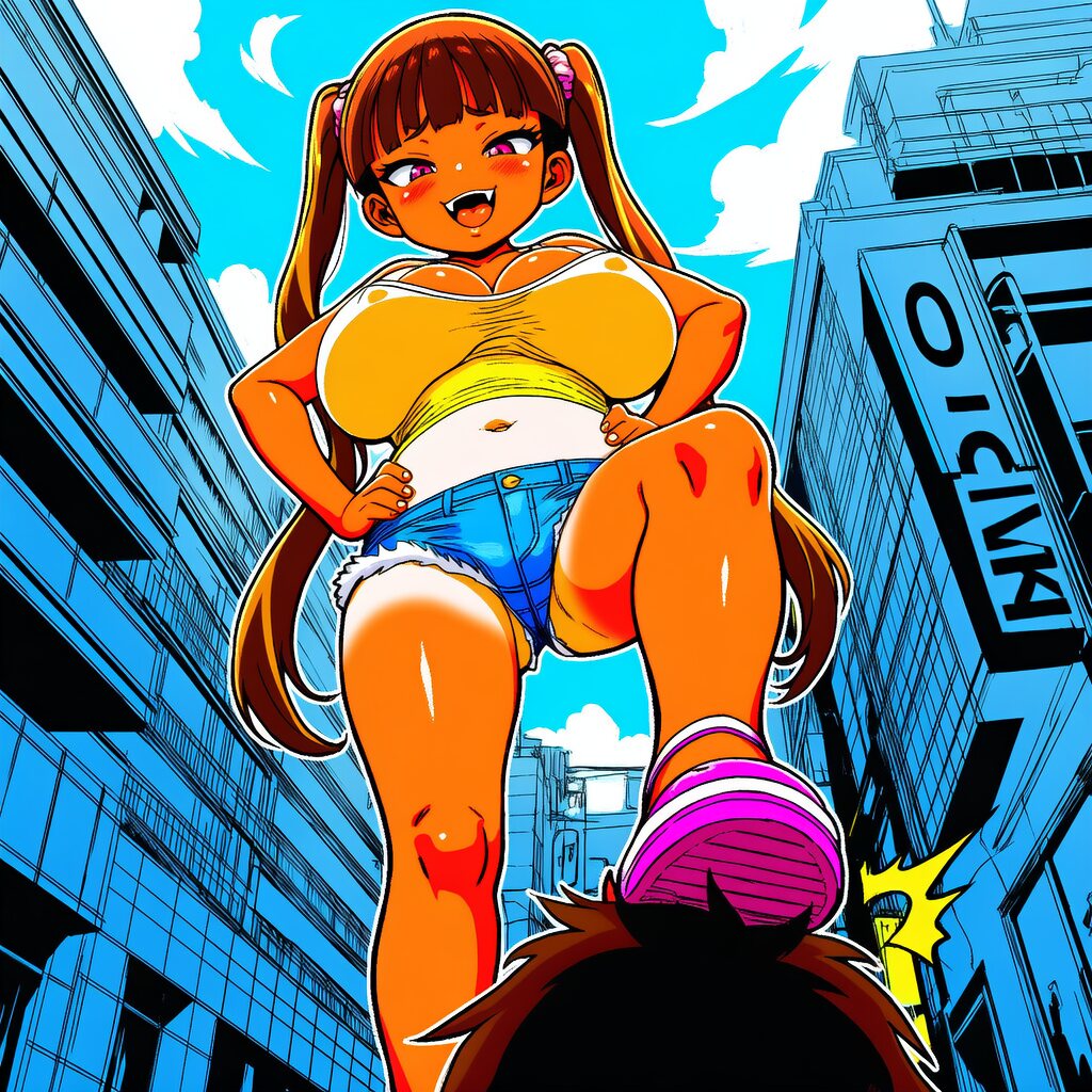外見年齢十歳程度。低身長。日焼けした肌。日焼け跡。釣り目がちな目つきや八重歯などまるでメスガキのような風貌。ロリ爆乳。腰まで届くツインテールの茶髪。