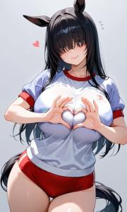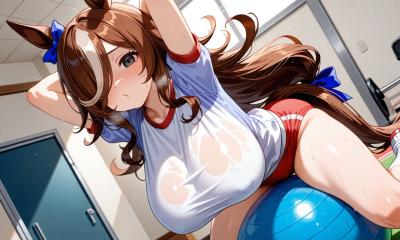 額には汗の跡が光っており、後方一気をした為か、ダートの砂埃を被った体操服は汗もあってか薄茶色に汚れている。ただ、そのおかげで汗で張り付き浮き上がった肌色やブラジャーが隠れていた為、ダブルマシュマロが目のやり場に困る事はなかった。