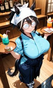眼鏡、DKPI、やや両メカクレ、芦毛ポニーテール、表裏の無い生真面目、超甘党、オレっ娘、青色アンダーリム眼鏡、または青色サングラス風眼鏡