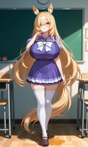 solo,girl,standard height,(full body shot),(honey blonde hair),long straight hair,(no ears),hazel brown eyes,(hair over eyes:1.1),(slit pupils, cat eyes),long bangs,honey blonde bangs,BREAK,masterpiece,(high quality),(huge breasts:1.3),(horse ears),(kemono ears),fluffy hair in the ears,glamorous,((ojou-sama pose)),hearty chortle,((tracen school uniform)