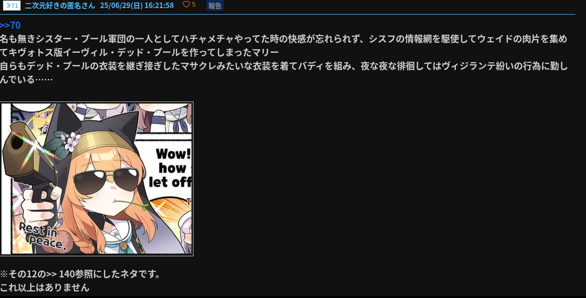 そういえばシスタープール軍団が出てきた時に、キヴォトスご当地デッドプール概念を思いつてたの思い出したから