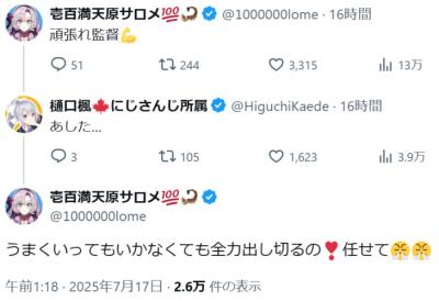 樋口監督も、楓組も、メンケアしてくれてたサロメ嬢も、応援してくれてたライバー達も、本当にありがとう! - 105二次元好きの匿名さん25/07/19(土) 09:24:18