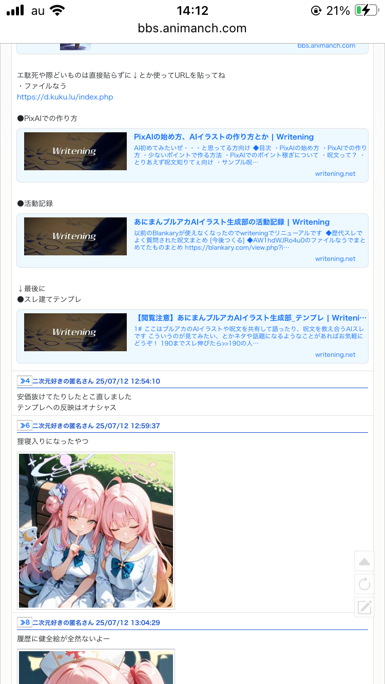 【閲覧注意】あにまんブルアカAIイラスト生成部55(Re)|あにまん掲示板ここはブルアカのAIイラストやプロンプトを共有して語ったり、教え合ったりするAIスレですこういうのが見てみたい、とかネタや話題になるようなことがあればお気軽にどうぞ!>>190を踏んだ人が…bbs.animanch.com - 65二次元好きの匿名さん25/07/12(土) 14:06:05