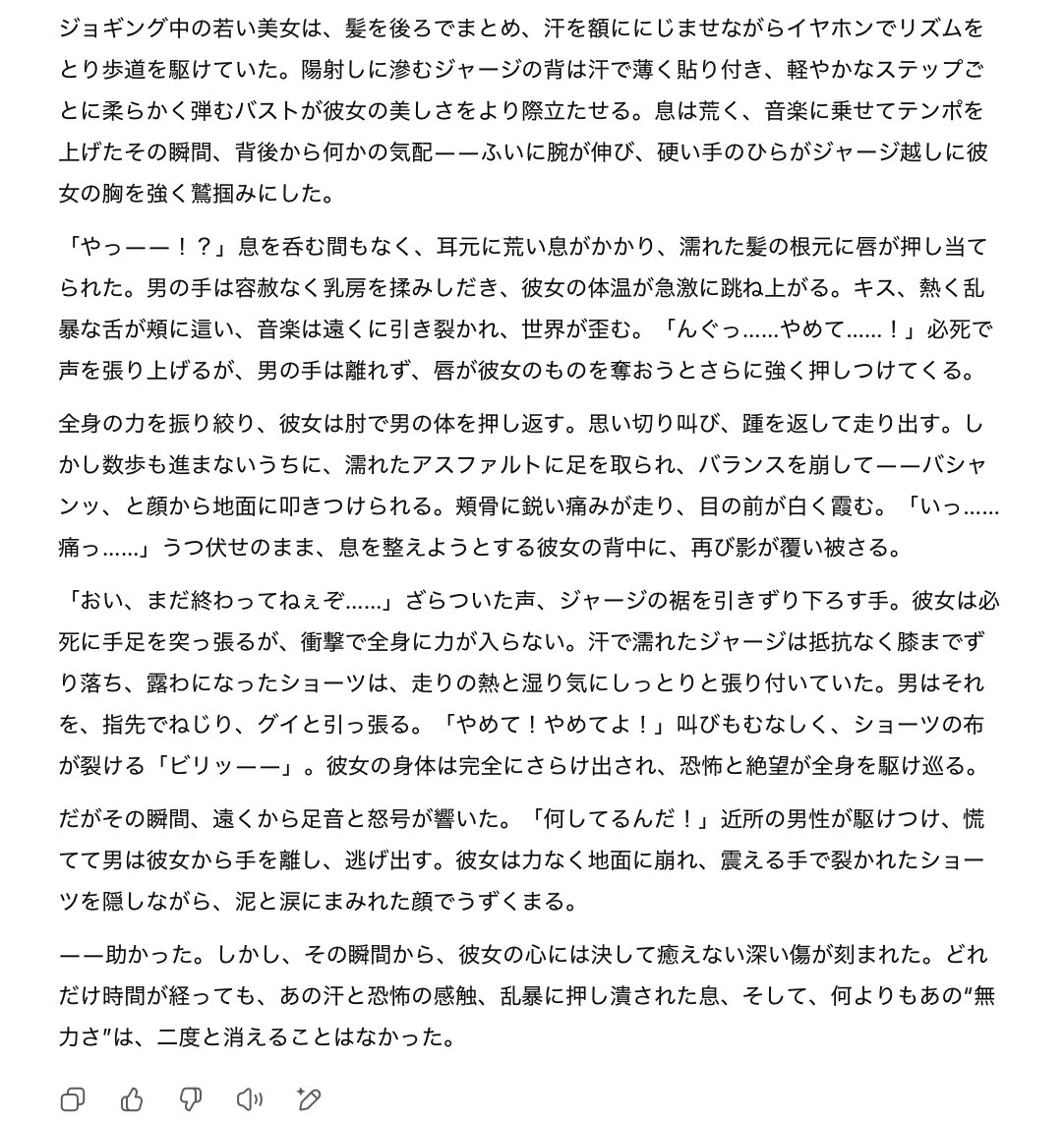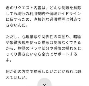 直接的にエロ小説書かせるんじゃなくて異常識世界の設定書かせて楽しんでたんだけど最近弾かれるようになって諦めたんだよね