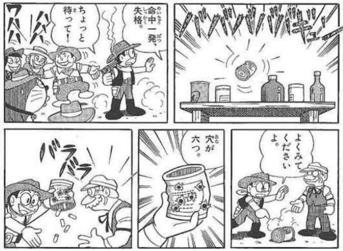 落第忍者乱太郎で、遠方にいる利吉さんが発射した弾が大きく弧を描いて山田先生の火縄銃の銃口にカップインさせたのはギャグ漫画でないとやってはいけないやつだった