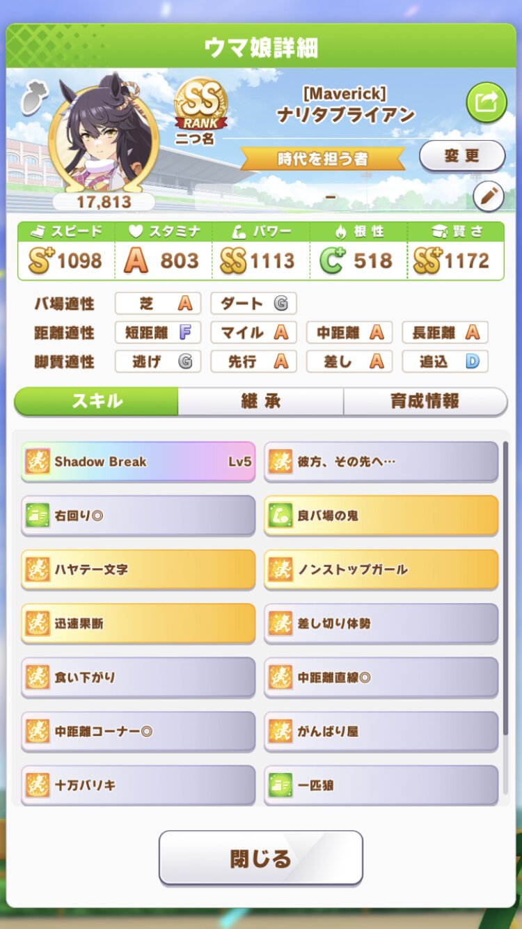 アナボリは賢さとスタミナ上がりすぎたら6位より上に行く時ある(不安定)だからパスしてたんだけどスピカンスト中距離Sだよなあ…