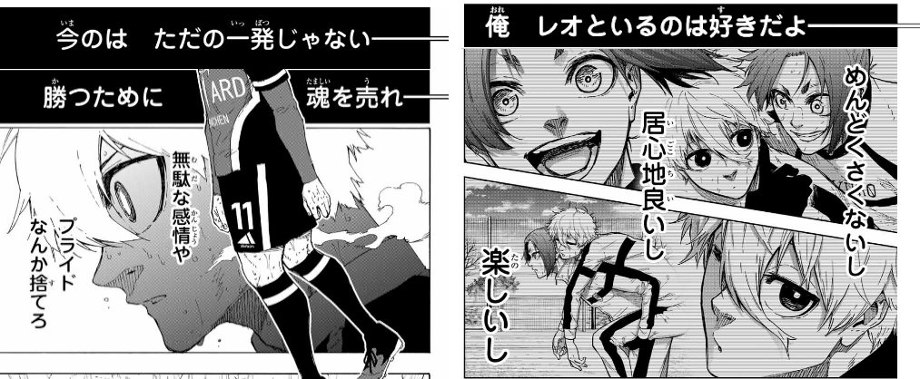 構図被せてるなって思うのは潔が吉良くん潰したとこと凪が舐岡潰したとこ、潔が入寮時走り出したとことV戦で凪が玲王の焦りを見てはしりだしたとこかな