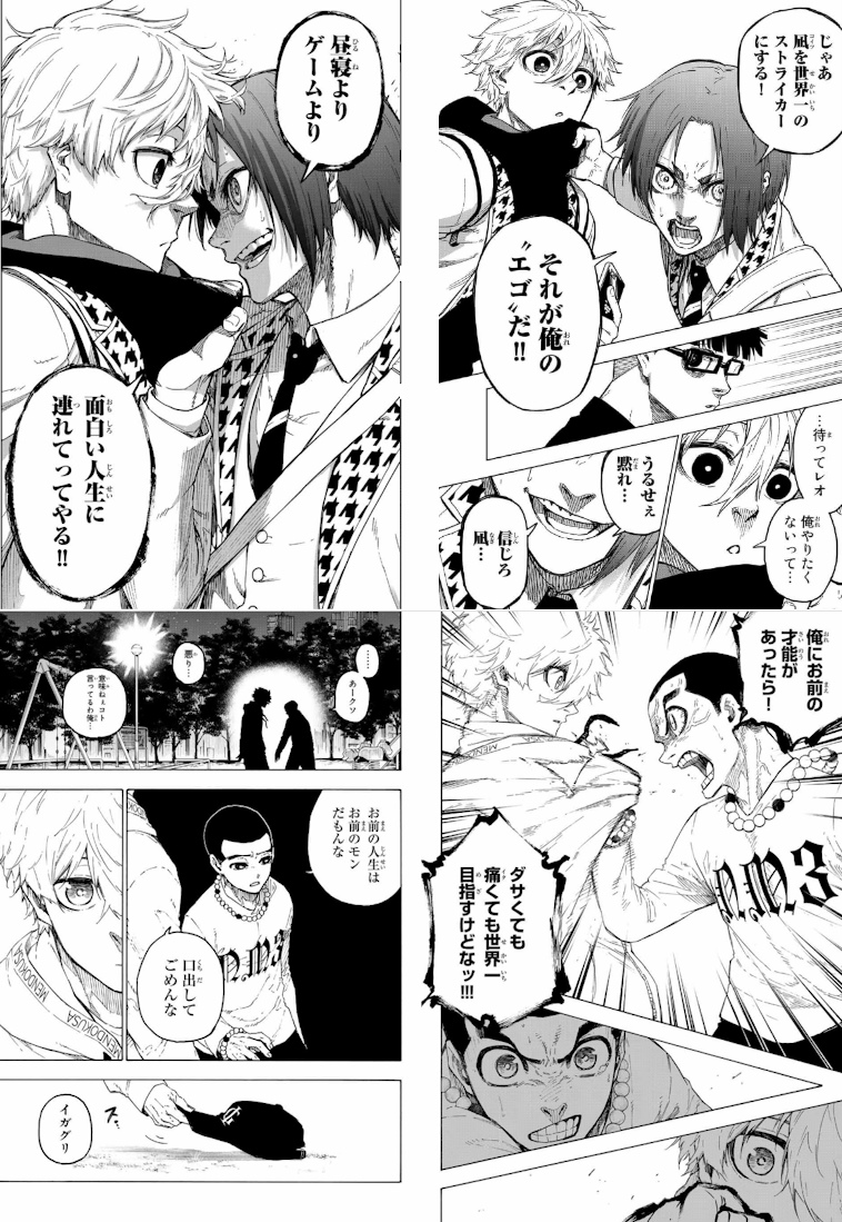 ここまでのページだと単に構図の癖っぽいんだけどエピ凪の次のページの玲王がイガグリの角度と被ってるから意図的かもとは感じる