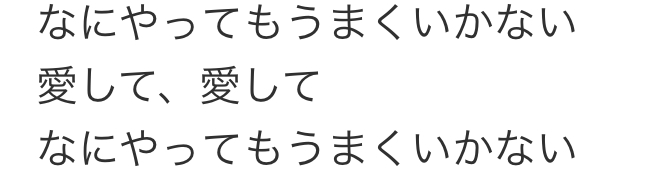 「なにやってもうまくいかない/meiyo」の歌詞 って「イイネ!」「(バカクソゴミクズきちゃない言葉で誰かを…」勇気をもらったり、泣けたり、癒されたり…、この歌詞をチェックしてみて!人の心を打つ「言葉」がぎっしり!www.uta-net.com - 38二次元好きの匿名さん25/07/19(土) 09:57:15