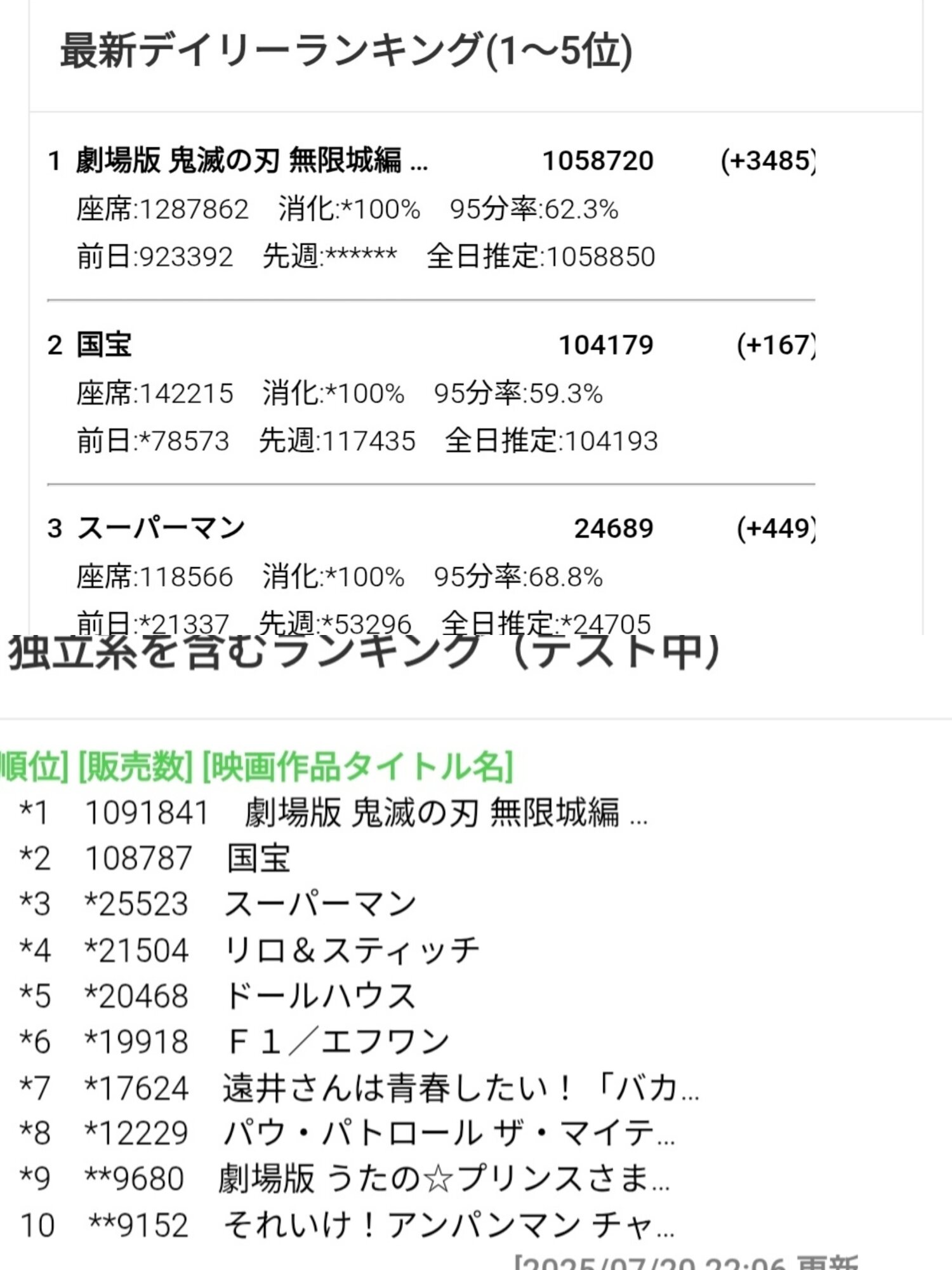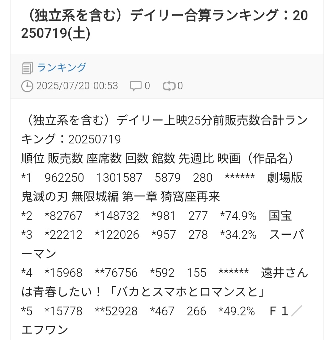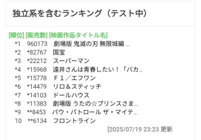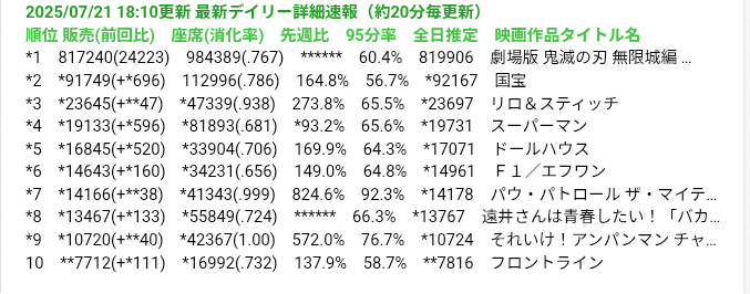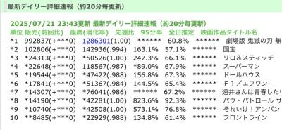 *1 1043694 2025/07/20(日) 鬼滅の刃 無限城編 ←3日目 (暫定) ←New
