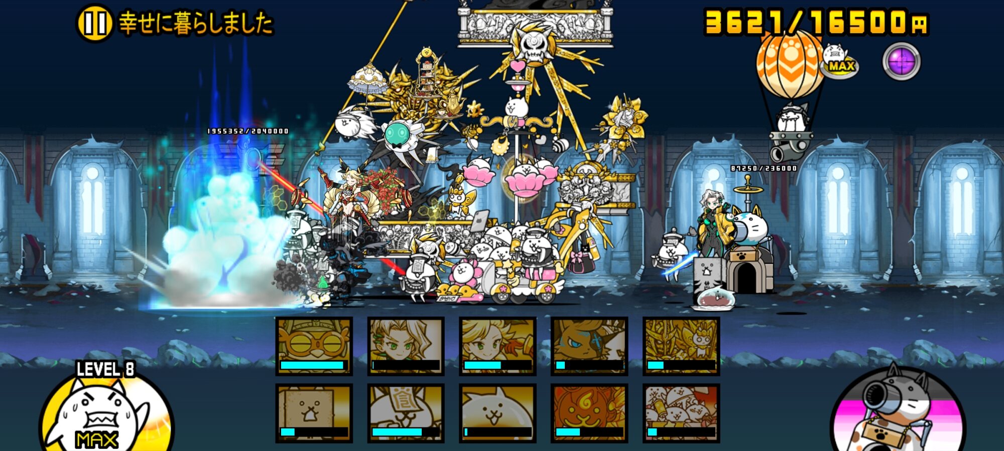 自城近くで戦うことを強制してくる烈波城、射程451あって体力や攻撃力や攻撃頻度もおかしい師匠、遠方吹っ飛ばしで嫌がらせしつつ城を狙うドリュウ、普通に強いイングリッスが幸暮を支える…