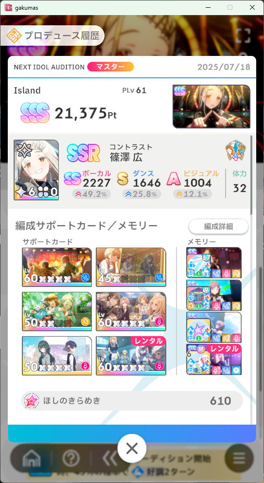 あとはレンタルメモリーでの開幕シュプレヒ、Pポイントじゃなくて3属性のパラメータついてるやつを探すとか - 23二次元好きの匿名さん25/07/25(金) 19:55:21