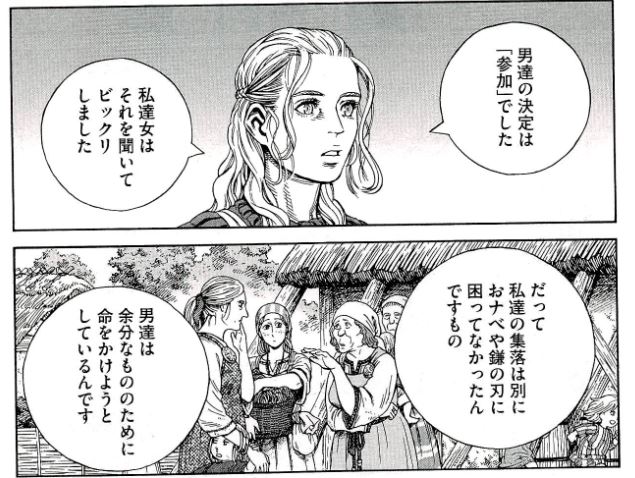 奴隷編でも防衛手段がないと侵略されて終わりだよねとエイナルにいわれ、旅立つ前にイーヴァルが現地人とイザコザが起きたらどうする、武力のバランスが大事だろうがといわれ、トルフィンもそれらを納得している癖に、頑なに武力を否定し続けた結果、開拓失敗だからね