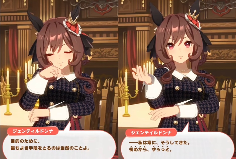 ジェンティルを打ち破った後に「これで良かったのか?」と聞いてくるゴルシに対して満面の笑みで「勝ててよかった」と答えるゴルトレ(元ジェントレ)
