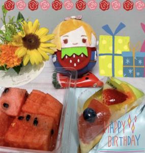 フルーツに囲まれて満足気で可愛いね、誕生日おめでとう!