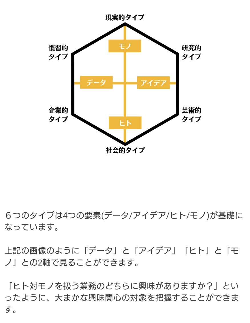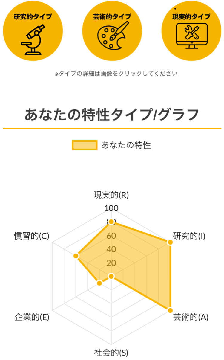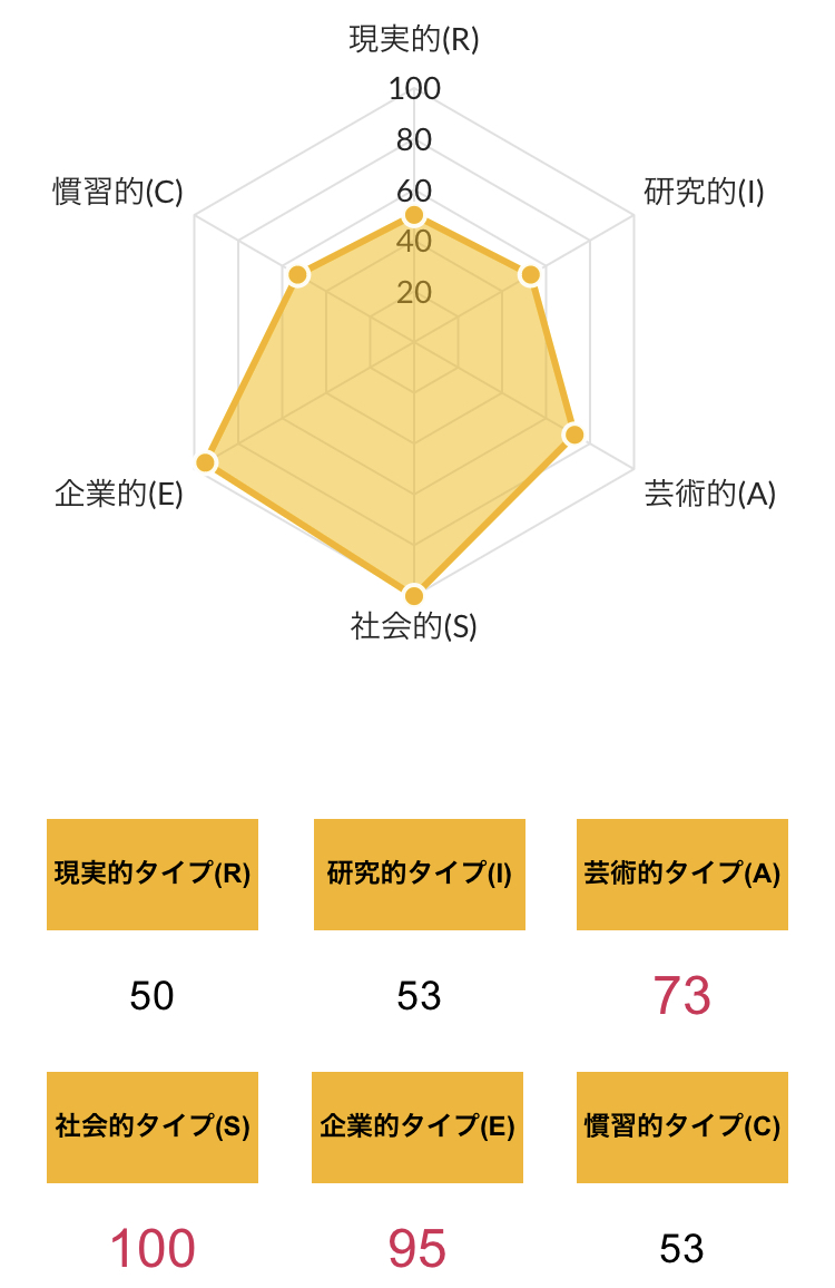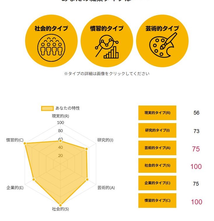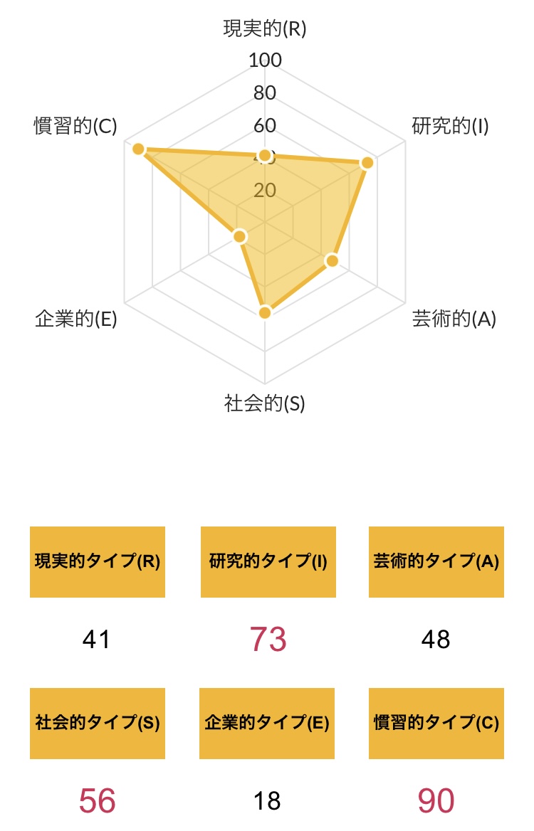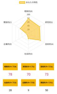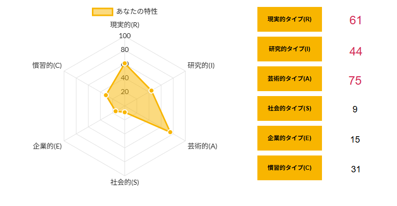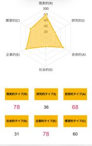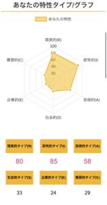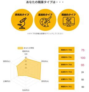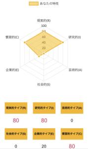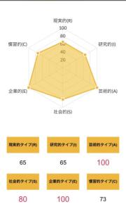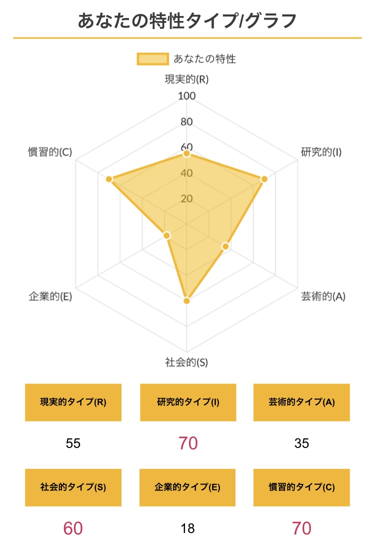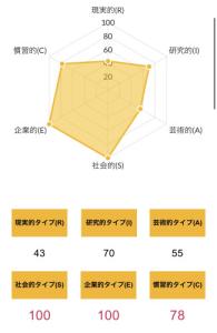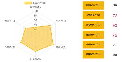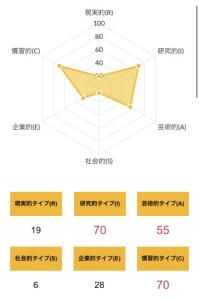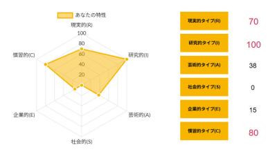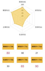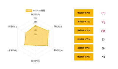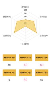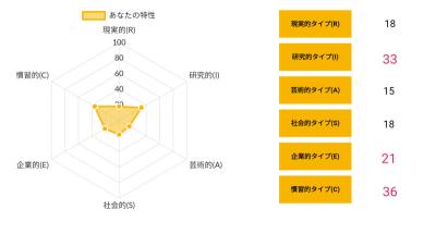 >>ホランドの6つのタイプのうち、特定のタイプの数値が高く、他のタイプの数値が低い状態を分化といい、そのタイプの発達度が高いと言えます。逆にすべてのタイプの数値が高い、または低いことを未分化といい、この場合は経験や学びが足りていないことになるため、さまざまな体験をしていく必要があるといえます。