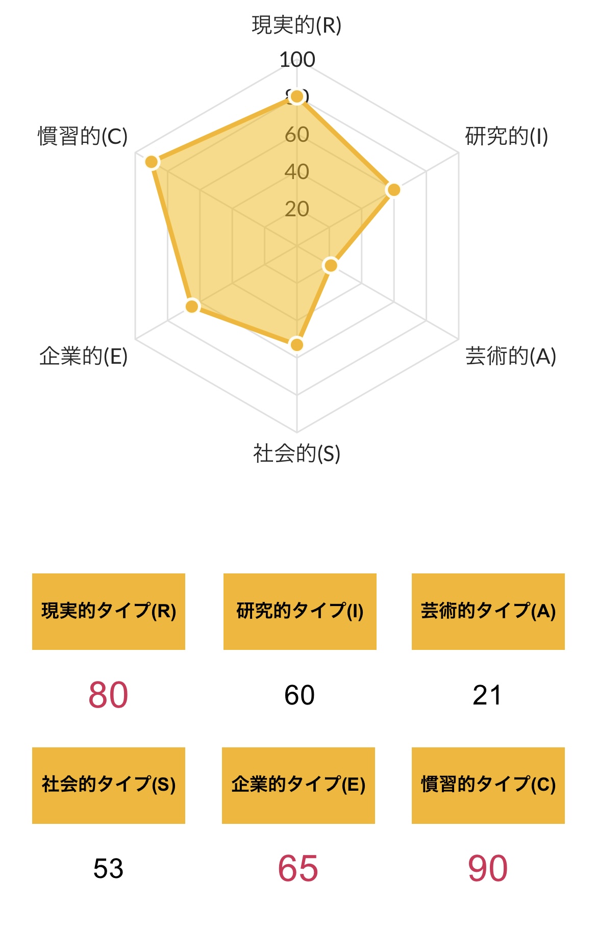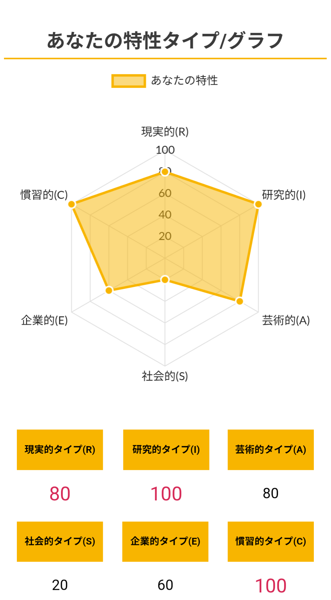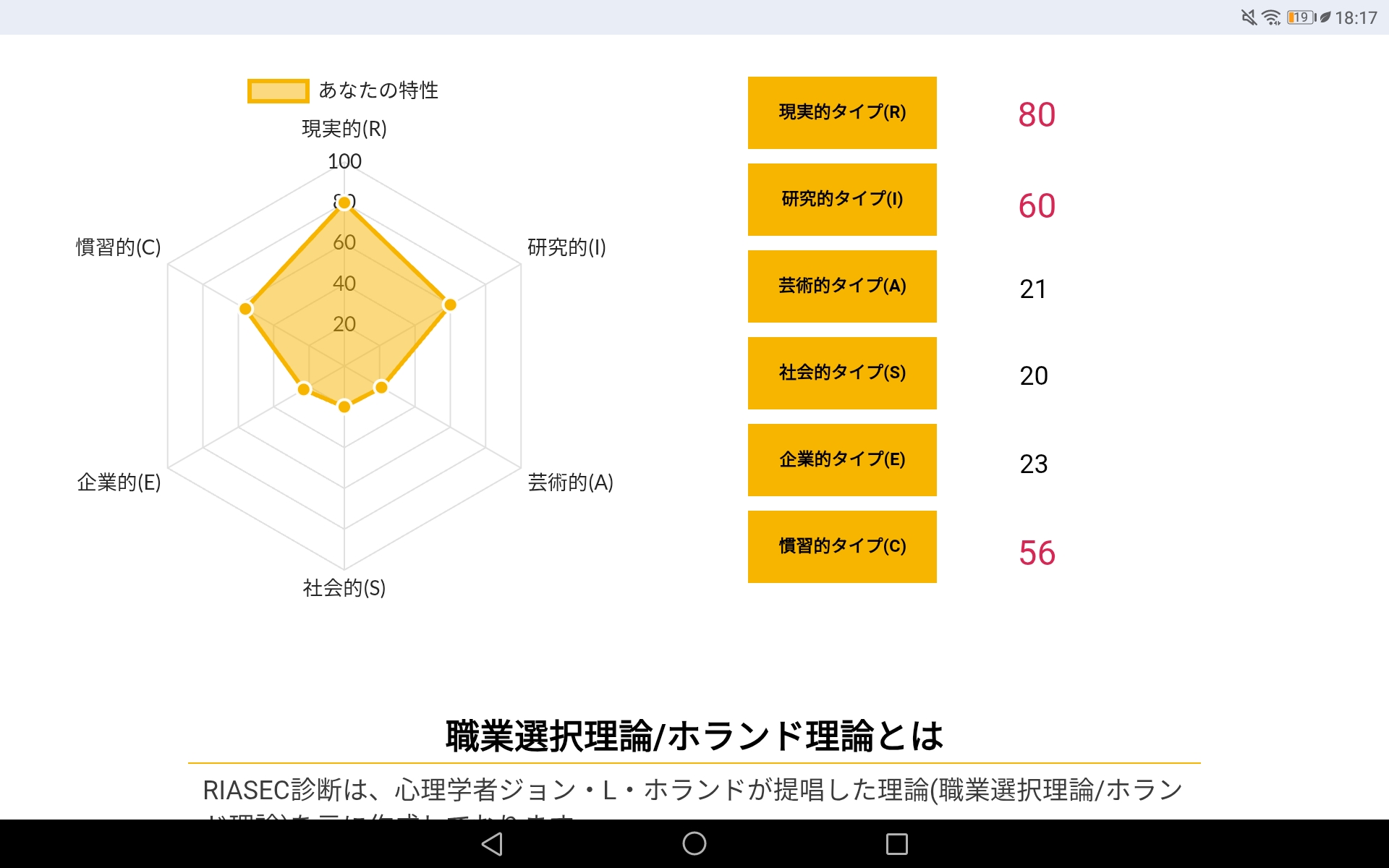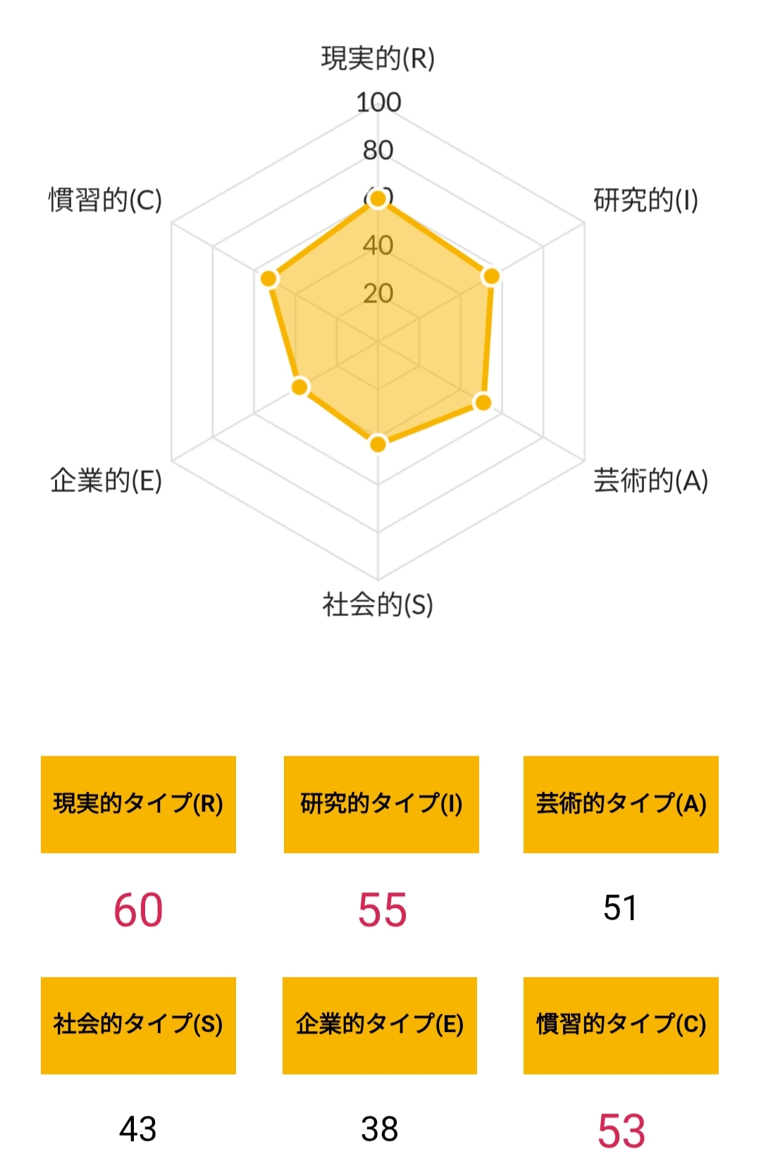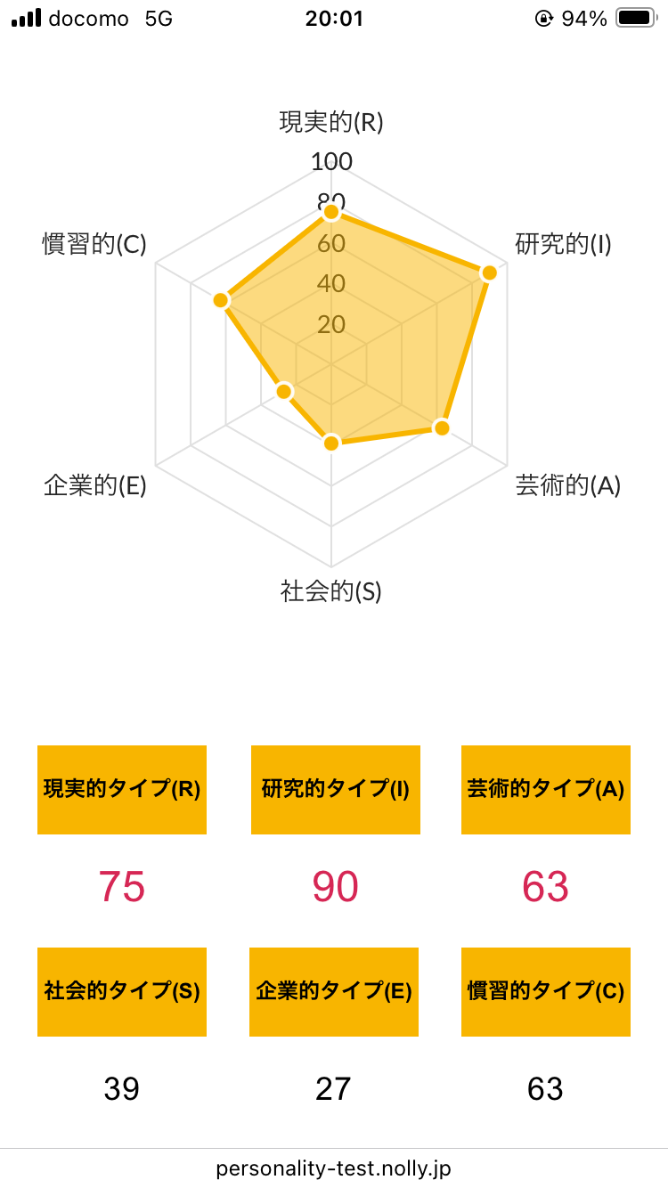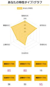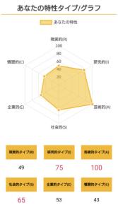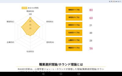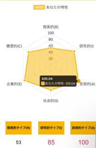>>ホランドの6つのタイプのうち、特定のタイプの数値が高く、他のタイプの数値が低い状態を分化といい、そのタイプの発達度が高いと言えます。逆にすべてのタイプの数値が高い、または低いことを未分化といい、この場合は経験や学びが足りていないことになるため、さまざまな体験をしていく必要があるといえます。