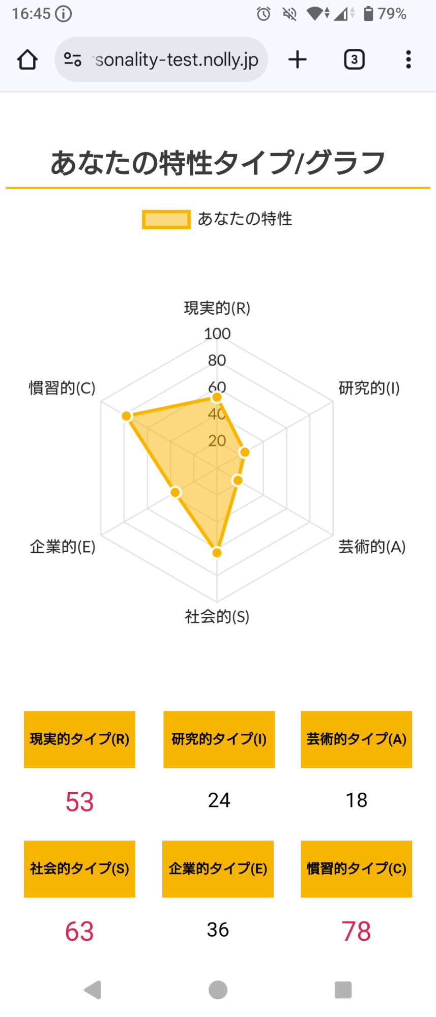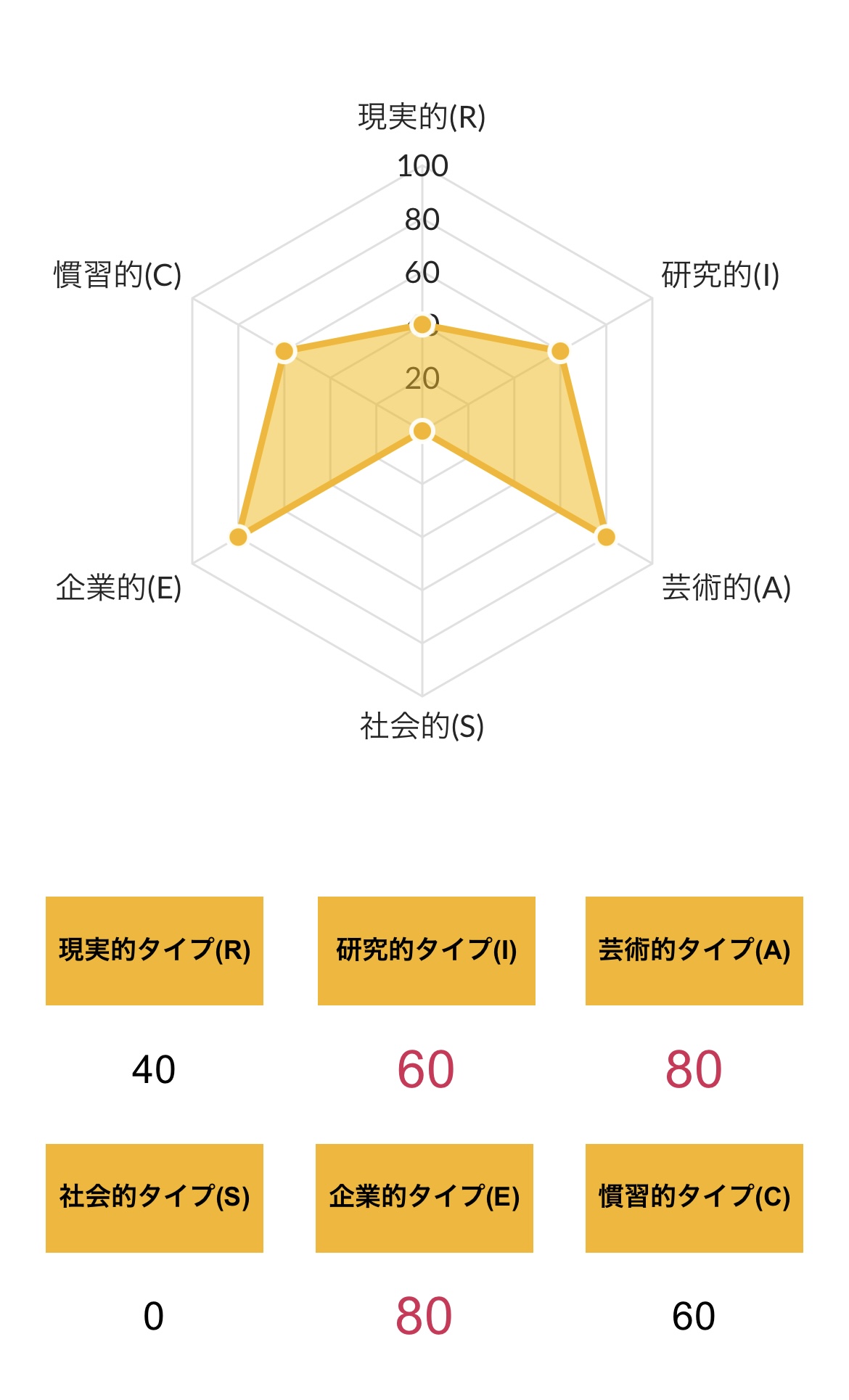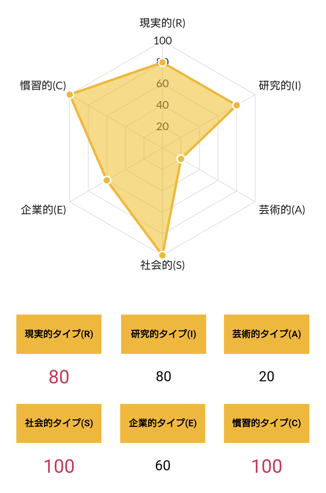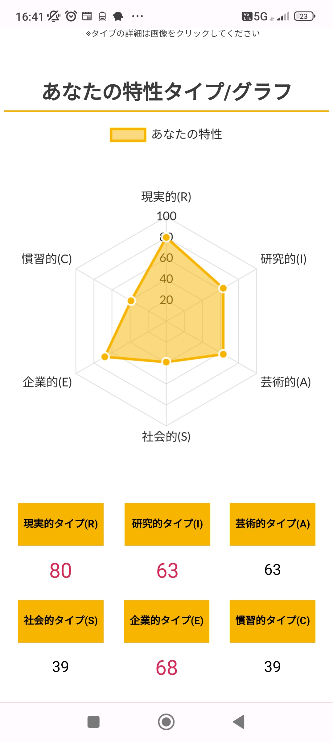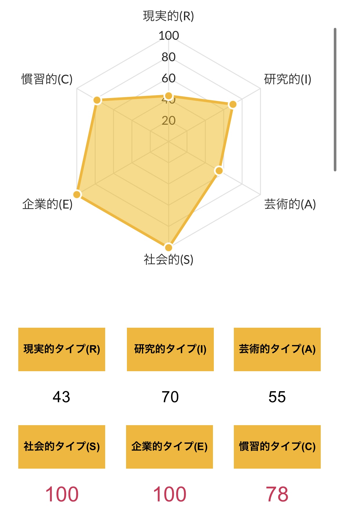 >>ホランドの6つのタイプのうち、特定のタイプの数値が高く、他のタイプの数値が低い状態を分化といい、そのタイプの発達度が高いと言えます。逆にすべてのタイプの数値が高い、または低いことを未分化といい、この場合は経験や学びが足りていないことになるため、さまざまな体験をしていく必要があるといえます。