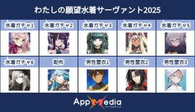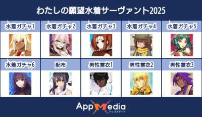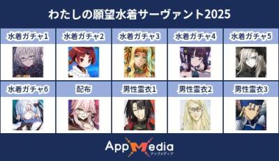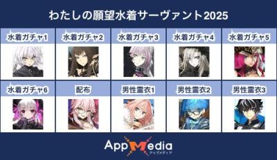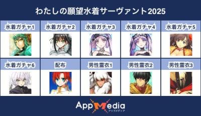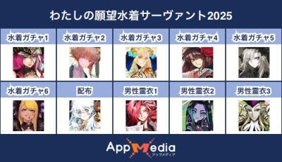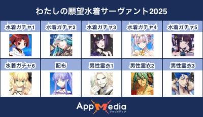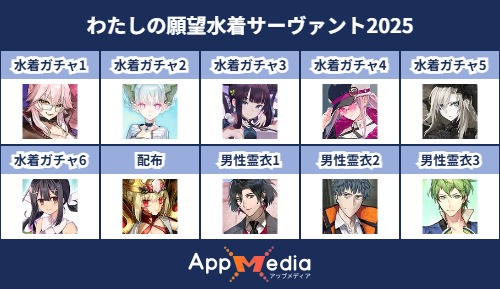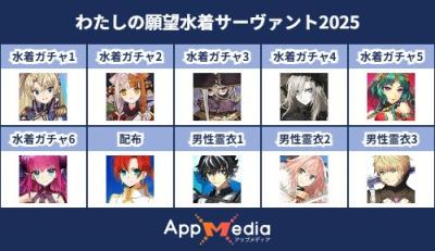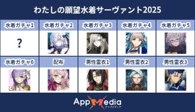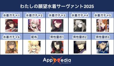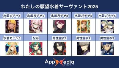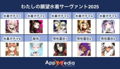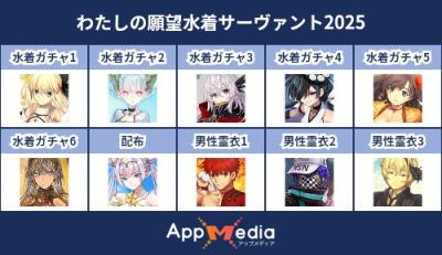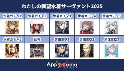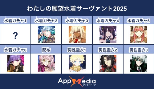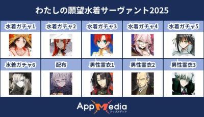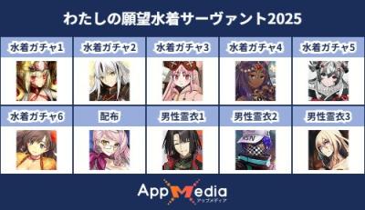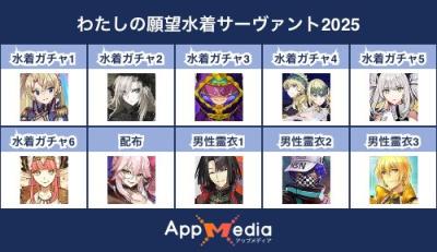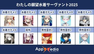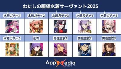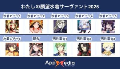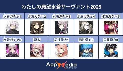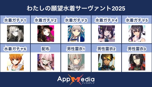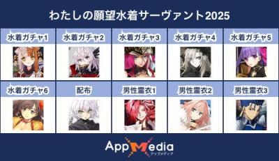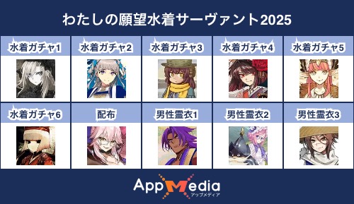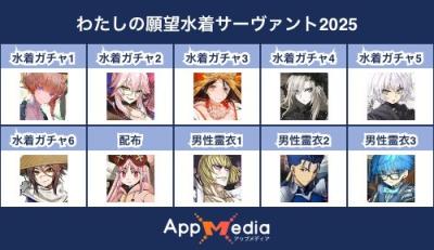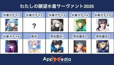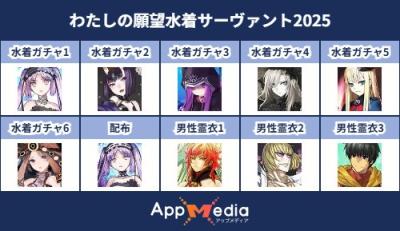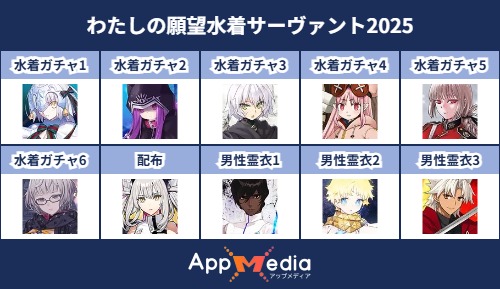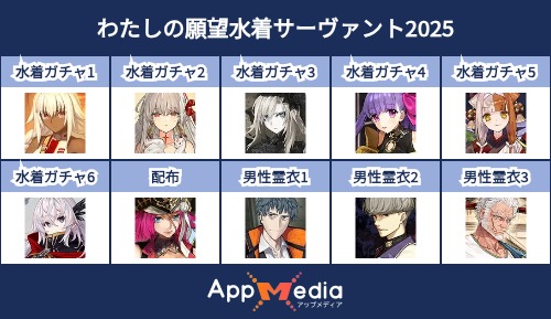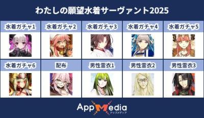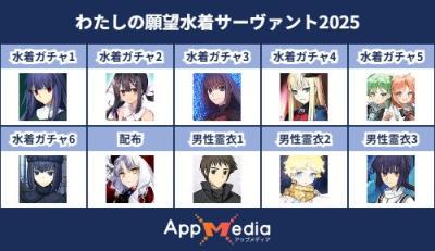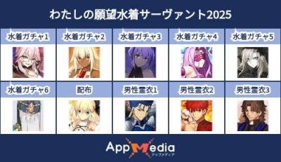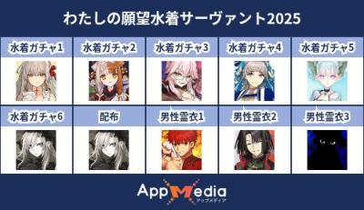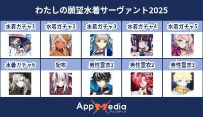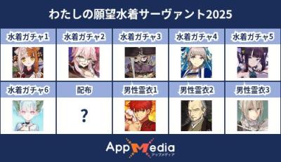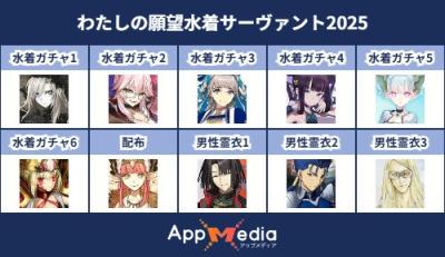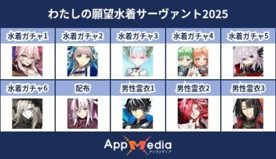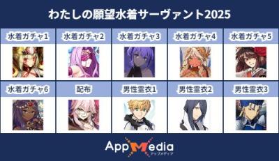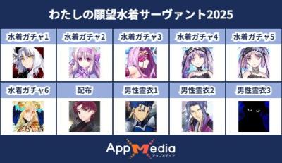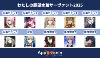 - 1二次元好きの匿名さん25/07/31(木) 17:48:07【FGO】水着サーヴァント10連予想2025 | AppMediaFGOの水着サーヴァントを予想するための画像生成ツールです。みんなの予想を投稿して共有する掲示板も設置しているので、今年の水着サーヴァントを予想する際にご活用ください。appmedia.jp