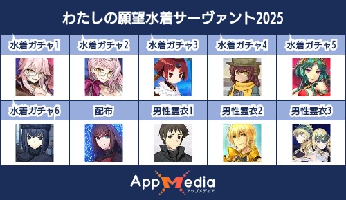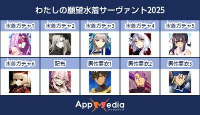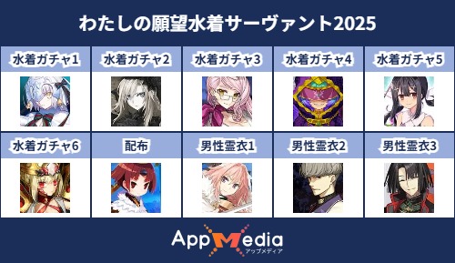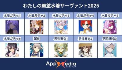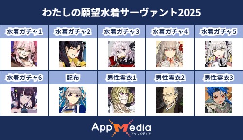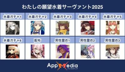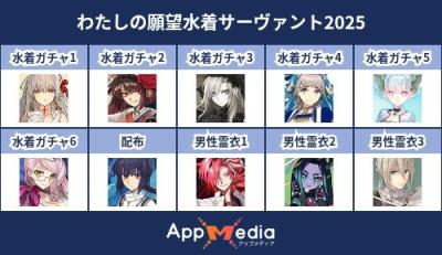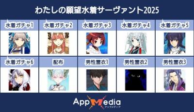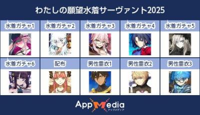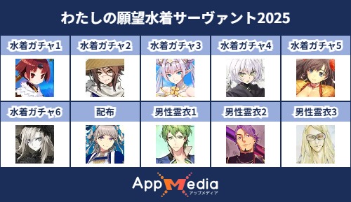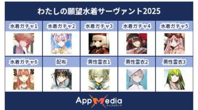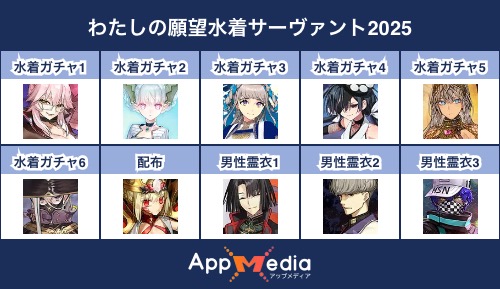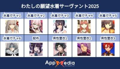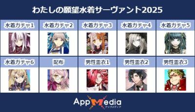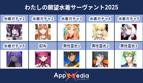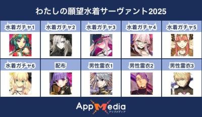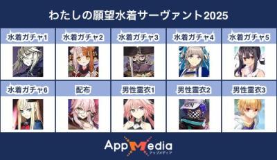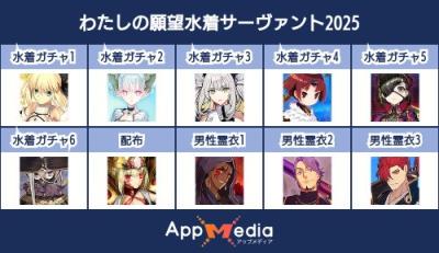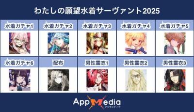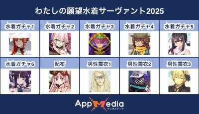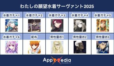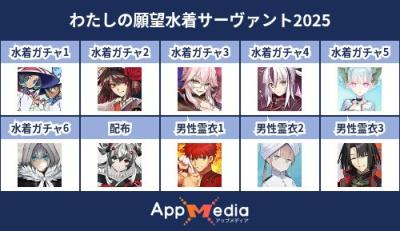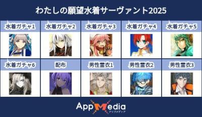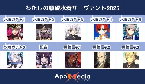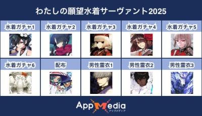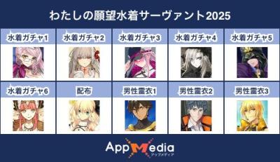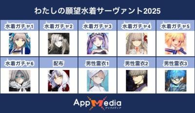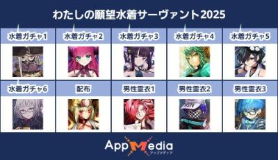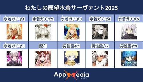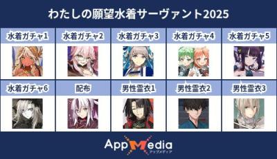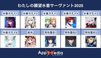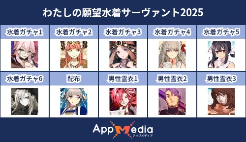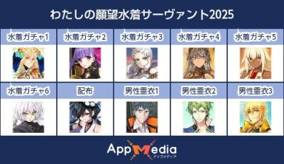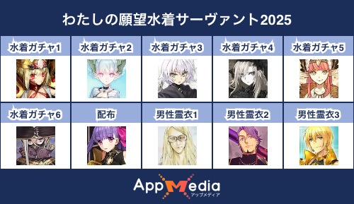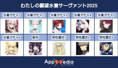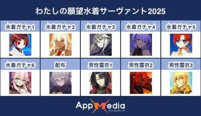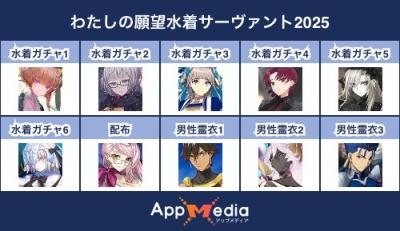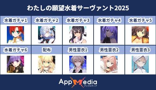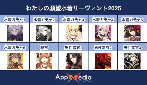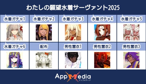 - 1二次元好きの匿名さん25/07/31(木) 17:48:07【FGO】水着サーヴァント10連予想2025 | AppMediaFGOの水着サーヴァントを予想するための画像生成ツールです。みんなの予想を投稿して共有する掲示板も設置しているので、今年の水着サーヴァントを予想する際にご活用ください。appmedia.jp