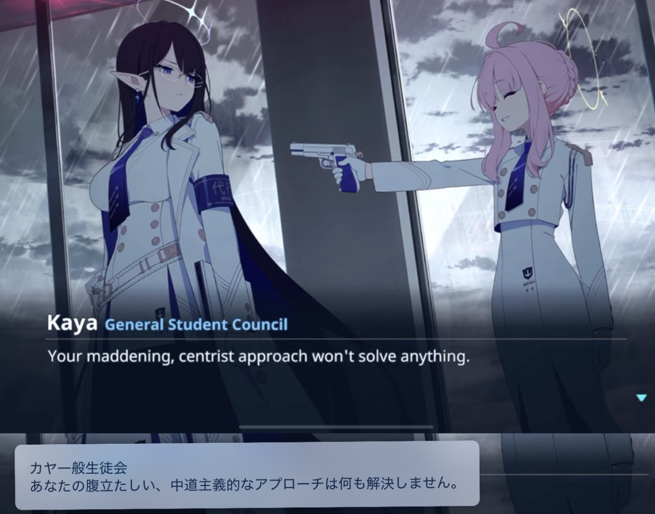 カヤが銃をリンに向けるシーンで