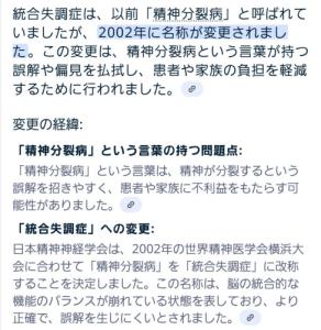 元々は精神分裂病って名前だったのが2002年に改名されている