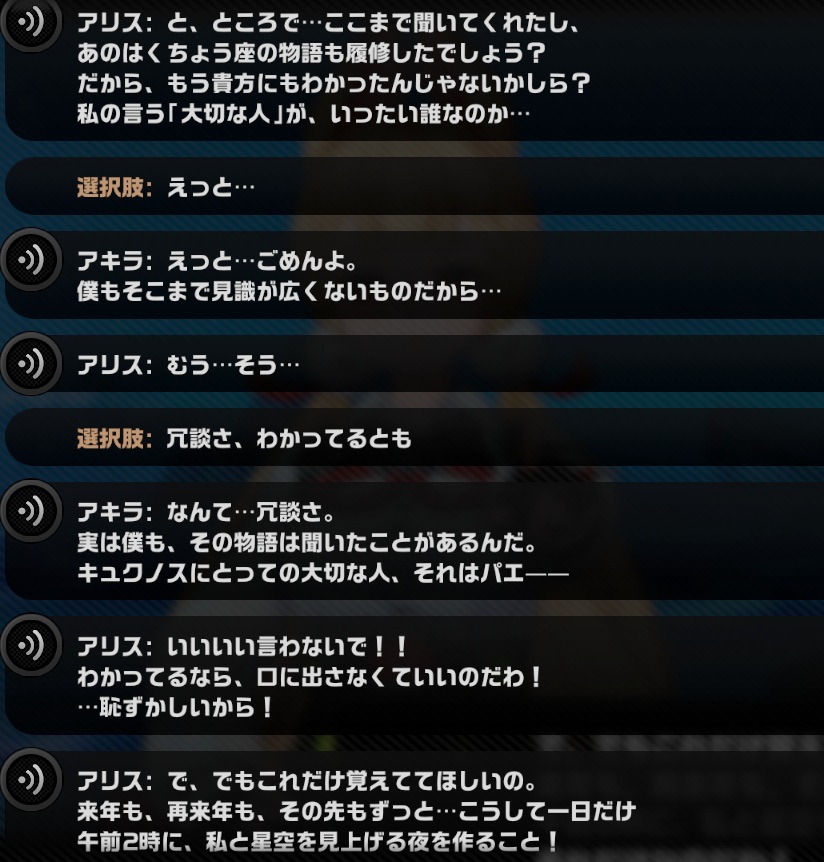 お誘いイベが初手から飛ばしてるけどアリスが1出して来た時にアキラが10ぐらい応えてる感じなのが草